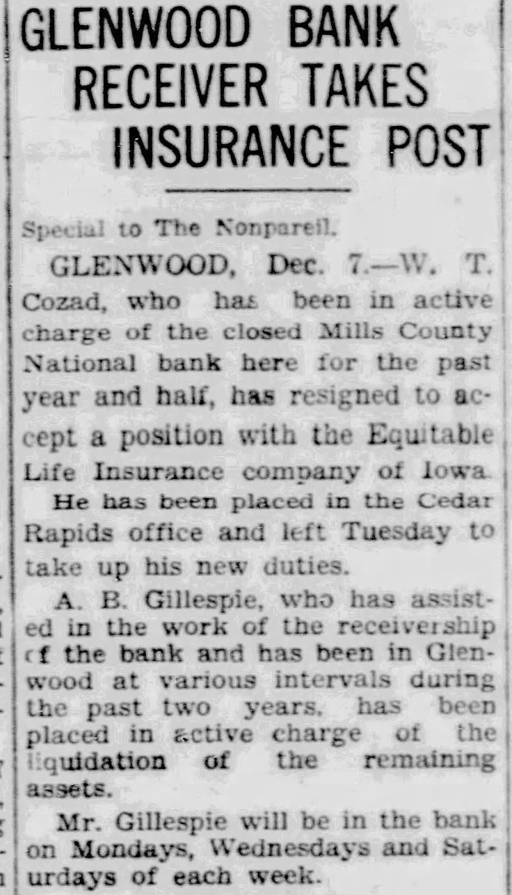GLENWOOD BANK RECEIVER TAKES INSURANCE POST Special to The Nonpareil. GLENWOOD, Dec. Cozad, who been in active charge of the closed Mills County National bank here for the past year and half, has resigned to accept a position with the Equitable Life Insurance company of lowa. He been placed the Cedar Rapids office and left Tuesday to take up his new duties. B. Gillespie, who has assistin the work the the bank and has been in Glenwood at various intervals during the past two years. has been placed active charge of the liquidation of the remaining assets. Mr. Gillespie will be in the bank on Mondays, Wednesdays and Saturdays of each week.