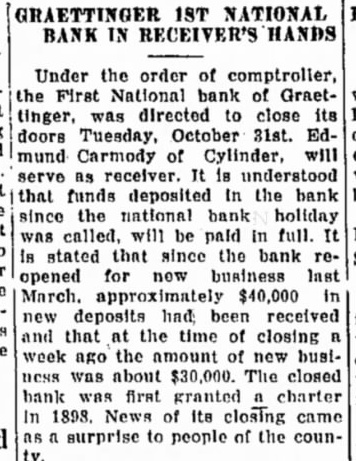 Under the order of comptroller, the First National bank Graettinger, was directed to close its doors Tuesday, October 31st. Edmund Carmody of Cylinder, will receiver. understood that funds deposited the bank since the national bank holiday called, will be paid full. stated that since the bank opened business last March. approximately deposits had been received and that at the time of closing week ago the amount busiabout $30,000. The closed bank first granted charter 1898. News its closing came surprise to people of the coun-
