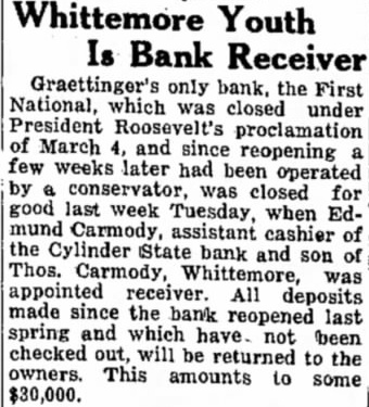 Whittemore Youth Is Bank Receiver Graettinger's only bank, the First National, which was closed under President proclamation of March and since reopening few weeks later had been operated by was closed for good last week Tuesday, when mund Carmody, assistant cashier of the State bank and son Thos. appointed Carmody, was receiver. All deposits made since the bank reopened last spring and which have. not been checked will be returned to the owners. This amounts to some
