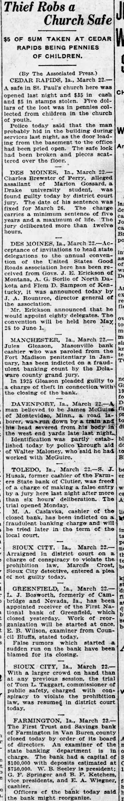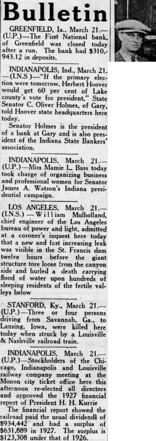 GREENFIELD, Ia., March First National bank, of Greenfield was closed today after run. The bank had $310,943.12 in deposits. INDIANAPOLIS. Ind., March 21. the primary election were Herbert Hoover would get 60 per cent of Lake county's vote for president,' State Senator C. Oliver Holmes, of Gary, told Hoover state headquarters here today. Senator Holmes is the president of a bank at Gary and is also president of the Indiana State Bankers' association. INDIANAPOLIS, March Mamie L. Bass today took charge of organizing business and women for Senator James A. Watson's Indiana presidential campaign. LOS ANGELES, March (I.N.S.) Mulholland, chief engineer of the Los Angeles bureau of power and light, admitted at coroner's inquest here today that new and fast increasing leak was visible in the St. Francis dam twelve hours before the giant structure tore loose from the canyon side and hurled death carrying flood of water upon hundreds of sleeping residents of the fertile valleys below STANFORD. Ky., March or four persons driving from Savannah, to Lansing, Iowa, were killed here today when struck by a Louisville & Nashville railroad train. INDIANAPOLIS. March of the Chicago, Indianapolis and Louisville railway company meeting at the Monon city ticket office here this afternoon re-elected all directors and approved the 1927 financial report of President H. H. Kurrie The financial report showed the railroad paid the usual dividends of $934,442 and had surplus of $631,889 in 1927. The surplus is $123,308 under that of 1926.