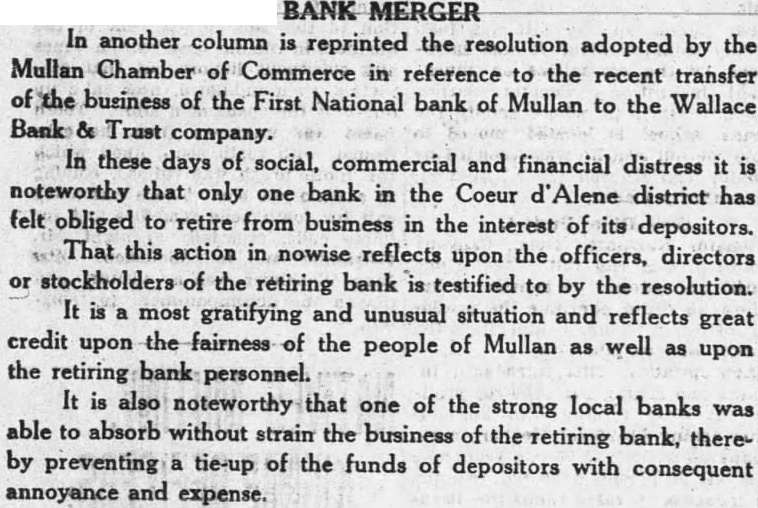 BANK MERGER In another column is reprinted the resolution adopted by the Mullan Chamber of Commerce in reference to the recent transfer of the business of the First National bank of Mullan to the Wallace Bank & Trust company. In these days of social, commercial and financial distress it is noteworthy that only one bank in the Coeur Alene district has felt obliged to retire from business in the interest of its depositors. That this action in nowise reflects upon the officers, directors or stockholders of the retiring bank is testified to by the resolution. It is a most gratifying and unusual situation and reflects great credit upon the fairness of the people of Mullan as well as upon the retiring bank personnel. It is also noteworthy that one of the strong local banks was able to absorb without strain the business of the retiring bank, thereby preventing a tie-up of the funds of depositors with consequent annoyance and expense.