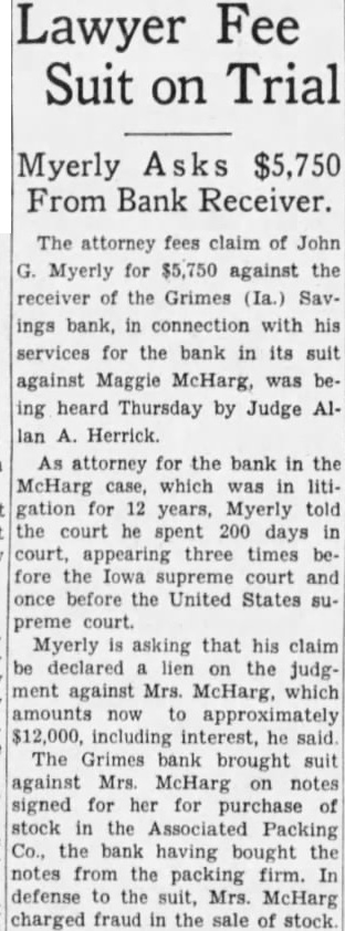 Lawyer Fee Suit on Trial Myerly Asks $5,750 From Bank Receiver. The attorney fees claim of John G. Myerly for $5,750 against the receiver of the Grimes (Ia.) Savings bank, in connection with his services for the bank in its suit against Maggie McHarg, was being heard Thursday by Judge Allan A. Herrick. As attorney for the bank in the McHarg case, which was in litigation for 12 years, Myerly told the court he spent 200 days in court, appearing three times before the Iowa supreme court and once before the United States supreme court. Myerly is asking that his claim be declared lien on the judgment against Mrs. McHarg, which amounts now to approximately $12,000. including interest, he said The Grimes bank brought suit against Mrs McHarg on notes signed for her for purchase of stock in the Associated Packing Co., the bank having bought the notes from the packing firm. In defense to the suit, Mrs. McHarg charged fraud in the sale of stock.
