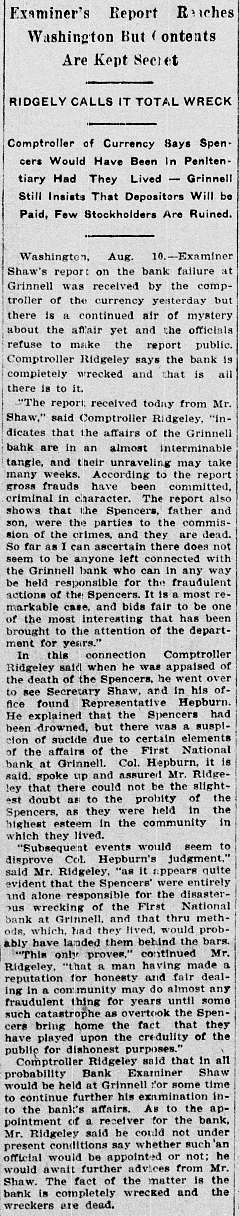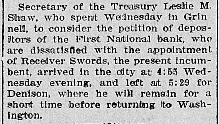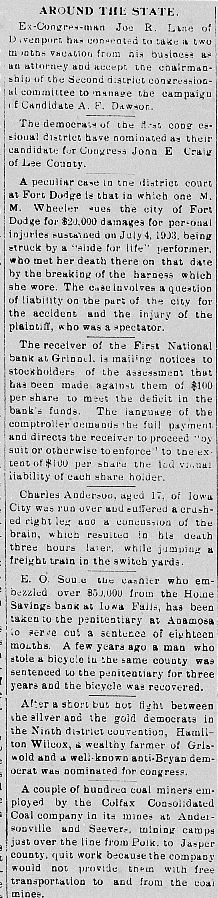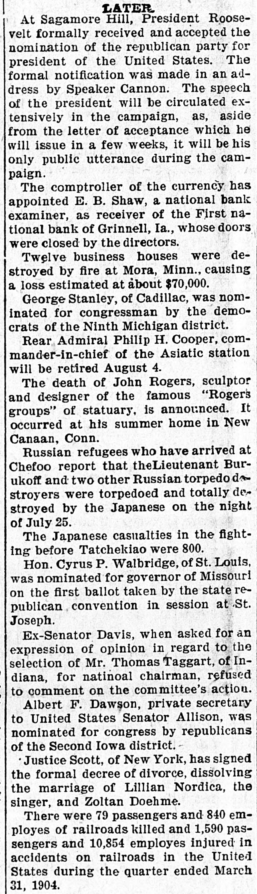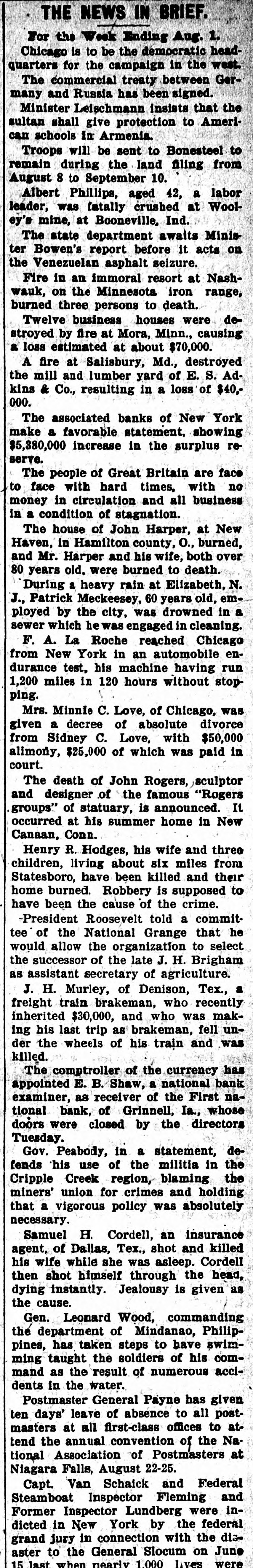 THE NEWS IN BRIEF. For the Week Ending Aug. 1. Chicago is to be the democratic headquarters for the campaign in the west. The commercial treaty between Germany and Russia has been signed. Minister Leischmann insists that the sultan shall give protection to American schools in Armenia. Troops will be sent to Bonesteel to remain during the land filing from August 8 to September 10. Albert Phillips, aged 42, a labor leader, was fatally crushed at Wooley's mine, at Booneville, Ind. The state department awaits Minister Bowen's report before it acts on the Venezuelan asphalt seizure. Fire in an immoral resort at Nashwauk, on the Minnesota iron range, burned three persons to death. Twelve business houses were destroyed by fire at Mora, Minn., causing a loss estimated at about $70,000. A fire at Salisbury, Md., destroyed the mill and lumber yard of E. S. Adkins & Co., resulting in a loss of $40,000. The associated banks of New York make a favorable statement, showing $5,380,000 increase in the surplus reserve. The people of Great Britain are face to face with hard times, with no money in circulation and all business in a condition of stagnation. The house of John Harper, at New Haven, in Hamilton county, O., burned, and Mr. Harper and his wife, both over 80 years old. were burned to death. During a heavy rain at Elizabeth, N. J., Patrick Meckeesey, 60 years old, employed by the city, was drowned in a sewer which he was engaged in cleaning. F. A. La Roche reached Chicago from New York in an automobile endurance test, his machine having run 1,200 miles in 120 hours without stopping. Mrs. Minnie C. Love, of Chicago, was given a decree of absolute divorce from Sidney C. Love, with $50,000 alimony, $25,000 of which was paid in court. The death of John Rogers, sculptor and designer of the famous "Rogers groups" of statuary, is announced. It occurred at his summer home in New Canaan, Conn. Henry R. Hodges, his wife and three children, living about six miles from Statesboro, have been killed and their home burned. Robbery is supposed to have been the cause of the crime. -President Roosevelt told a committee of the National Grange that he would allow the organization to select the successor of the late J. H. Brigham as assistant secretary of agriculture. J. H. Murley, of Denison, Tex., a freight train brakeman, who recently inherited $30,000, and who was making his last trip as brakeman, fell under the wheels of his train and was killed. The comptroller of the currency has appointed E. B. Shaw, a national bank examiner, as receiver of the First national bank, of Grinnell, Ia., whose doors were closed by the directors Tuesday. Gov. Peabody, in a statement, defends his use of the militia in the Cripple Creek region, blaming the miners' union for crimes and holding that a vigorous policy was absolutely necessary. Samuel H. Cordell, an insurance agent, of Dallas, Tex., shot and killed his wife while she was asleep. Cordell then shot himself through the head, dying instantly. Jealousy is given as the cause. Gen. Leonard Wood, commanding the department of Mindanao, Philippines, has taken steps to have swimming taught the soldiers of his command as the result of numerous accidents in the water. Postmaster General Payne has given ten days' leave of absence to all postmasters at all first-class offices to attend the annual convention of the National Association of Postmasters at Niagara Falls, August 22-25. Capt. Van Schaick and Federal Steamboat Inspector Fleming and Former Inspector Lundberg were indicted in New York by the federal grand jury in connection with the disaster to the General Slocum on June 15 last when nearly 1.000 lives were