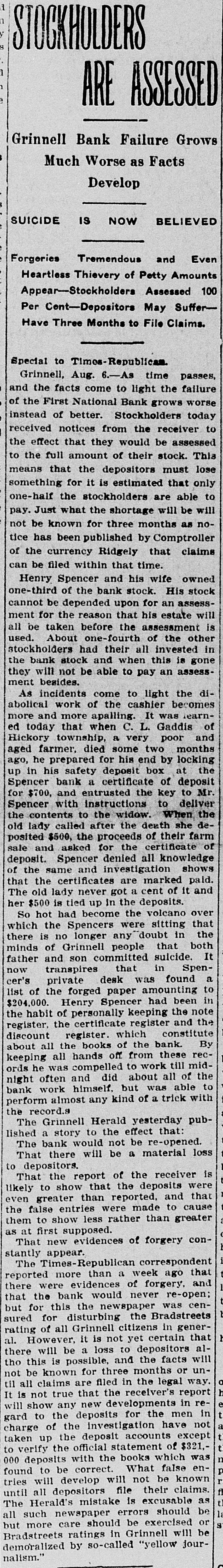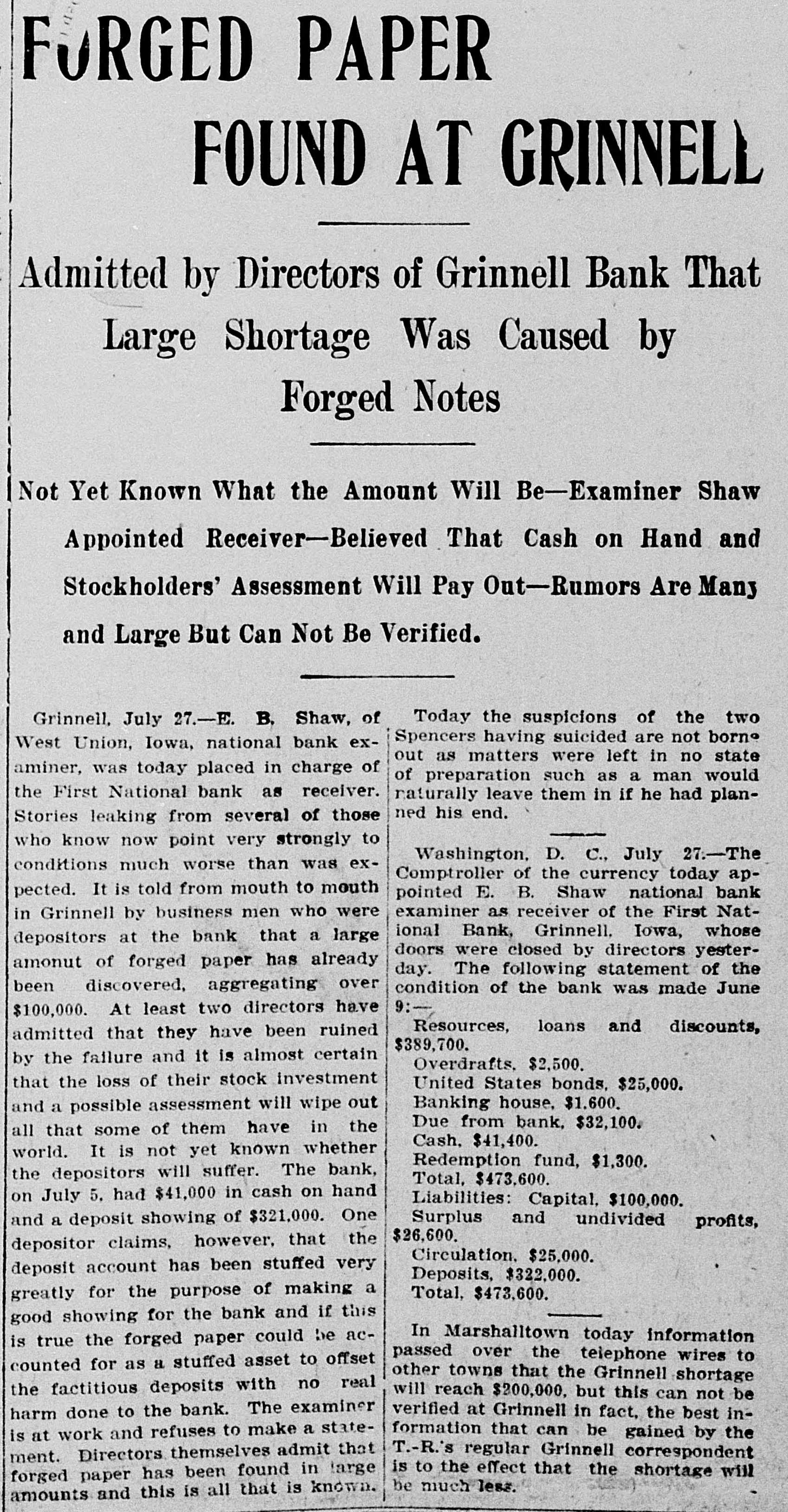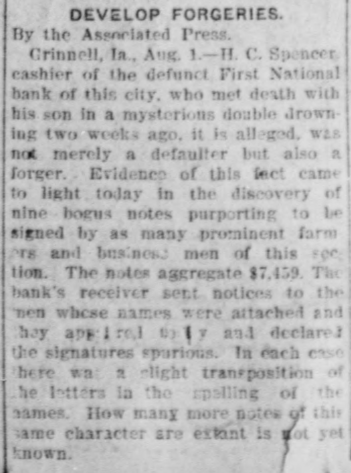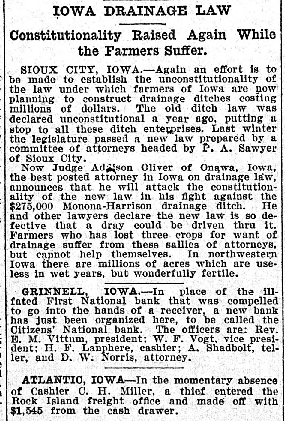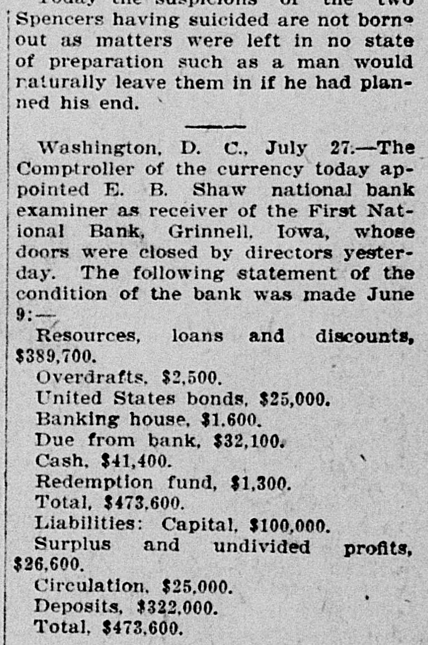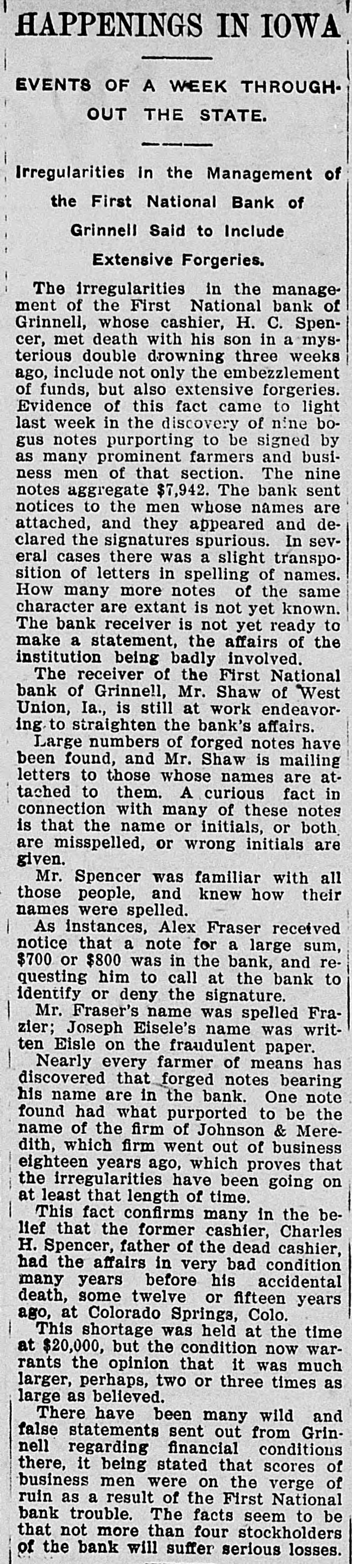 THE NEWS IN BRIEF. For the Week Ending Aug. 1. Chicago is to be the democratic headquarters for the campaign in the west. The commercial treaty between Germany and Russia has been signed. Minister Leischmann insists that the sultan shall give protection to American schools in Armenia. Troops will be sent to Bonesteel to remain during the land filing from August 8 to September 10. Albert Phillips, aged 42, a labor leader, was fatally crushed at Wooley's mine, at Booneville, Ind. The state department awaits Minister Bowen's report before it acts on the Venezuelan asphalt seizure. Fire in an immoral resort at Nashwauk, on the Minnesota iron range, burned three persons to death. Twelve business houses were destroyed by fire at Mora, Minn., causing a loss estimated at about $70,000. A fire at Salisbury, Md., destroyed the mill and lumber yard of E. S. Adkins & Co., resulting in a loss of $40,000. The associated banks of New York make a favorable statement, showing $5,380,000 increase in the surplus reserve. The people of Great Britain are face to face with hard times, with no money in circulation and all business in a condition of stagnation. The house of John Harper, at New Haven, in Hamilton county, O., burned, and Mr. Harper and his wife, both over 80 years old. were burned to death. During a heavy rain at Elizabeth, N. J., Patrick Meckeesey, 60 years old, employed by the city, was drowned in a sewer which he was engaged in cleaning. F. A. La Roche reached Chicago from New York in an automobile endurance test, his machine having run 1,200 miles in 120 hours without stopping. Mrs. Minnie C. Love, of Chicago, was given a decree of absolute divorce from Sidney C. Love, with $50,000 alimony, $25,000 of which was paid in court. The death of John Rogers, sculptor and designer of the famous "Rogers groups" of statuary, is announced. It occurred at his summer home in New Canaan, Conn. Henry R. Hodges, his wife and three children, living about six miles from Statesboro, have been killed and their home burned. Robbery is supposed to have been the cause of the crime. -President Roosevelt told a committee of the National Grange that he would allow the organization to select the successor of the late J. H. Brigham as assistant secretary of agriculture. J. H. Murley, of Denison, Tex., a freight train brakeman, who recently inherited $30,000, and who was making his last trip as brakeman, fell under the wheels of his train and was killed. The comptroller of the currency has appointed E. B. Shaw, a national bank examiner, as receiver of the First national bank, of Grinnell, Ia., whose doors were closed by the directors Tuesday. Gov. Peabody, in a statement, defends his use of the militia in the Cripple Creek region, blaming the miners' union for crimes and holding that a vigorous policy was absolutely necessary. Samuel H. Cordell, an insurance agent, of Dallas, Tex., shot and killed his wife while she was asleep. Cordell then shot himself through the head, dying instantly. Jealousy is given as the cause. Gen. Leonard Wood, commanding the department of Mindanao, Philippines, has taken steps to have swimming taught the soldiers of his command as the result of numerous accidents in the water. Postmaster General Payne has given ten days' leave of absence to all postmasters at all first-class offices to attend the annual convention of the National Association of Postmasters at Niagara Falls, August 22-25. Capt. Van Schaick and Federal Steamboat Inspector Fleming and Former Inspector Lundberg were indicted in New York by the federal grand jury in connection with the disaster to the General Slocum on June 15 last when nearly 1.000 lives were