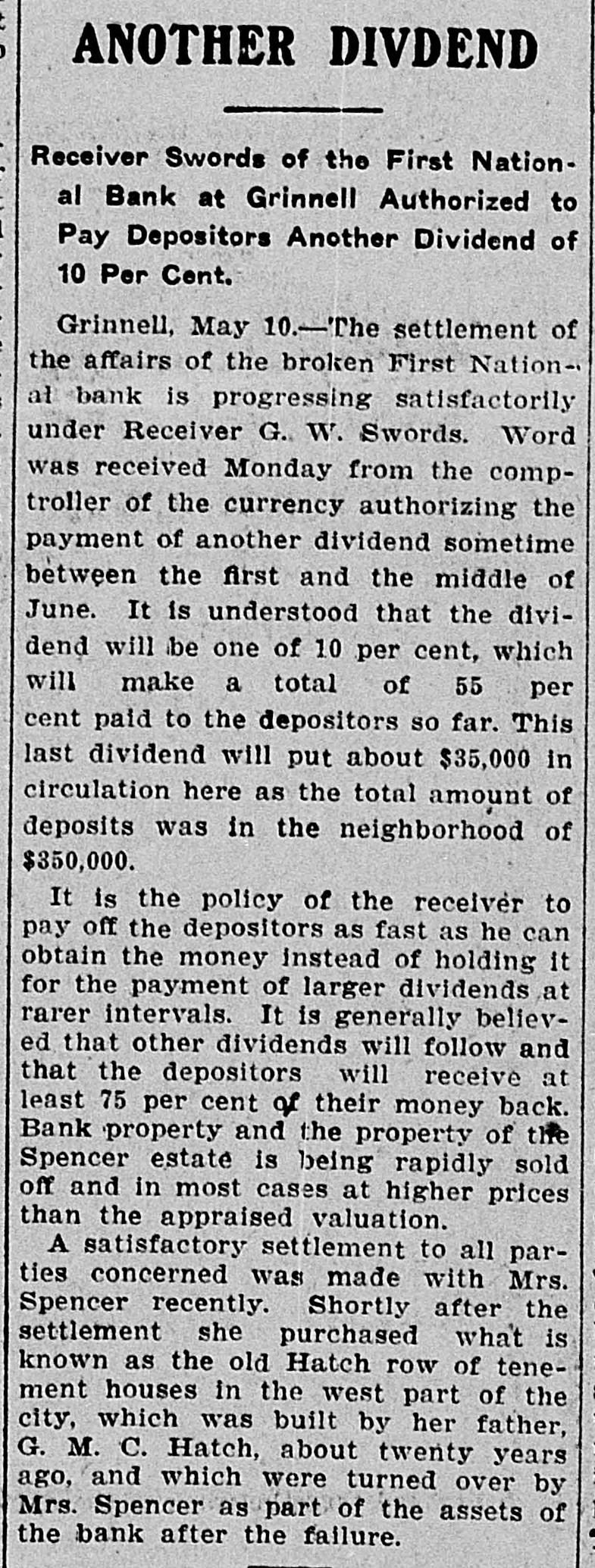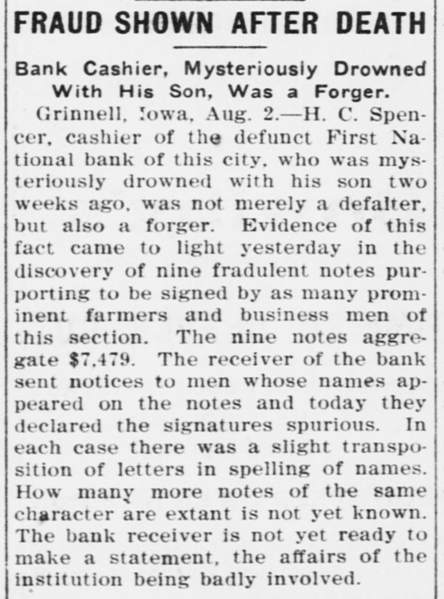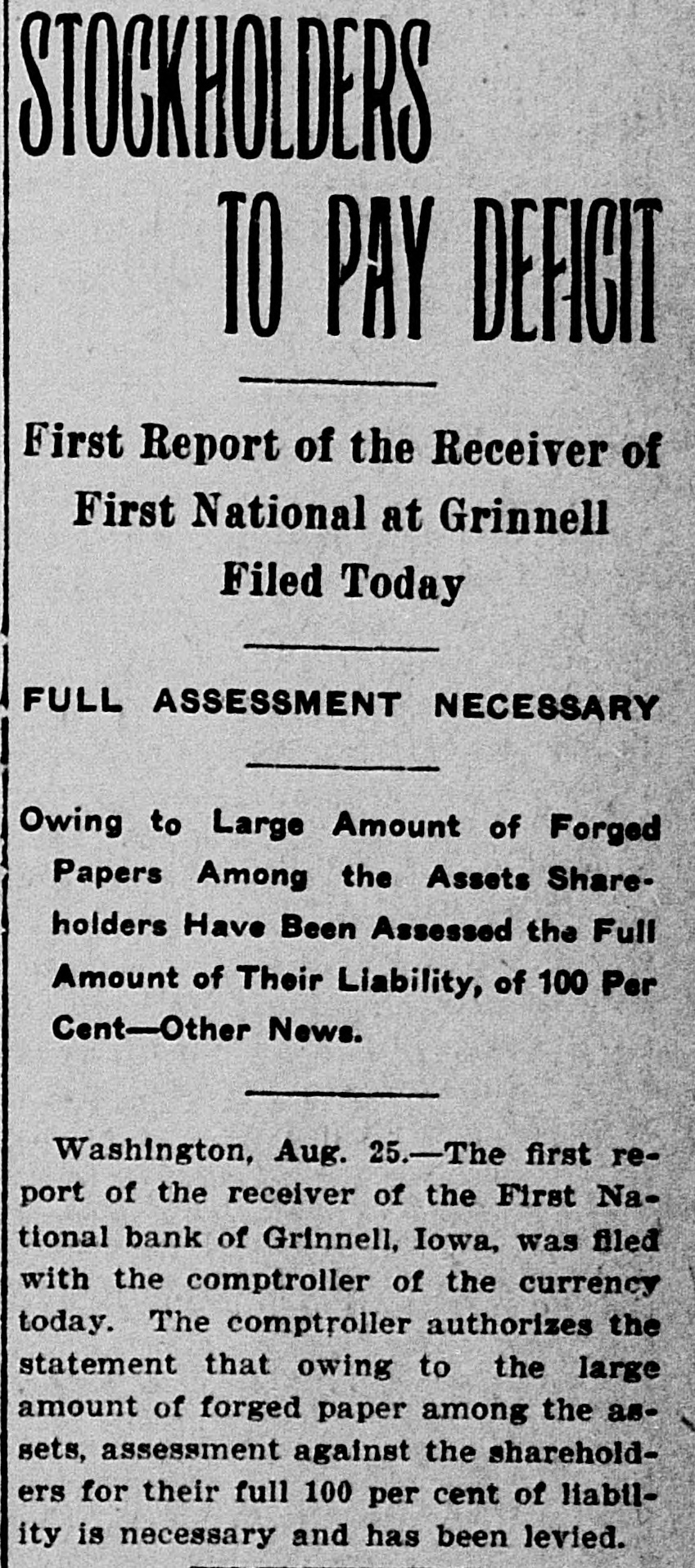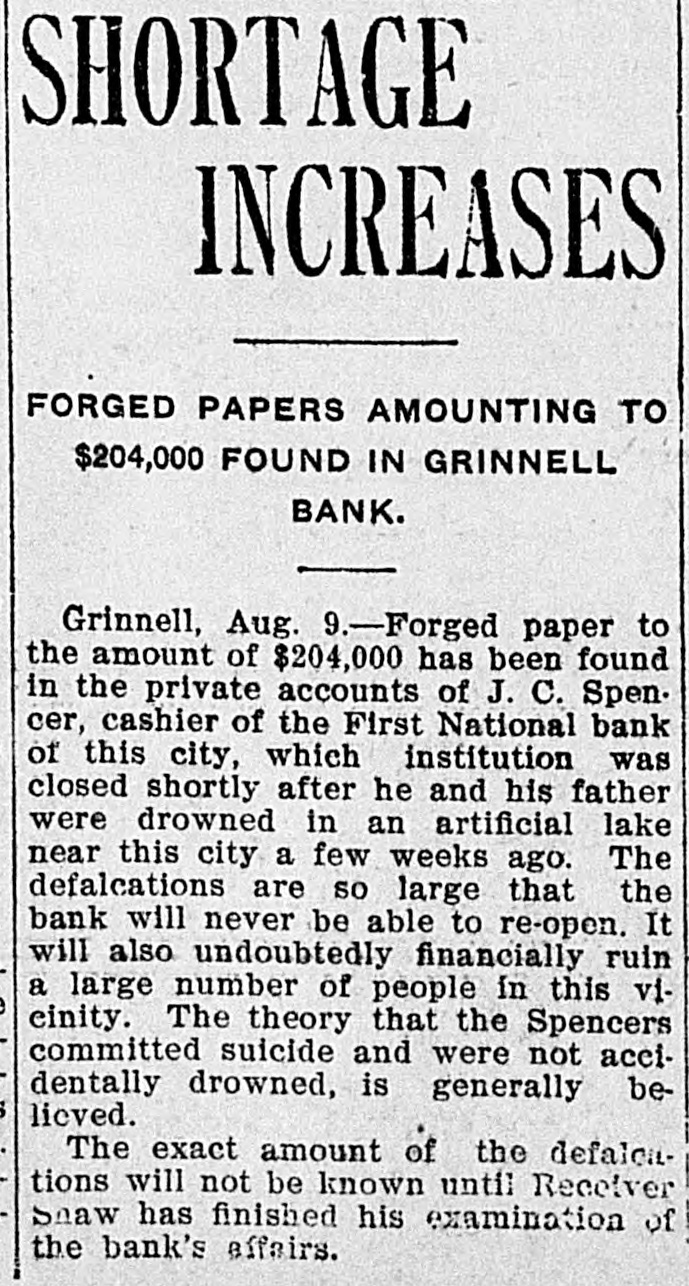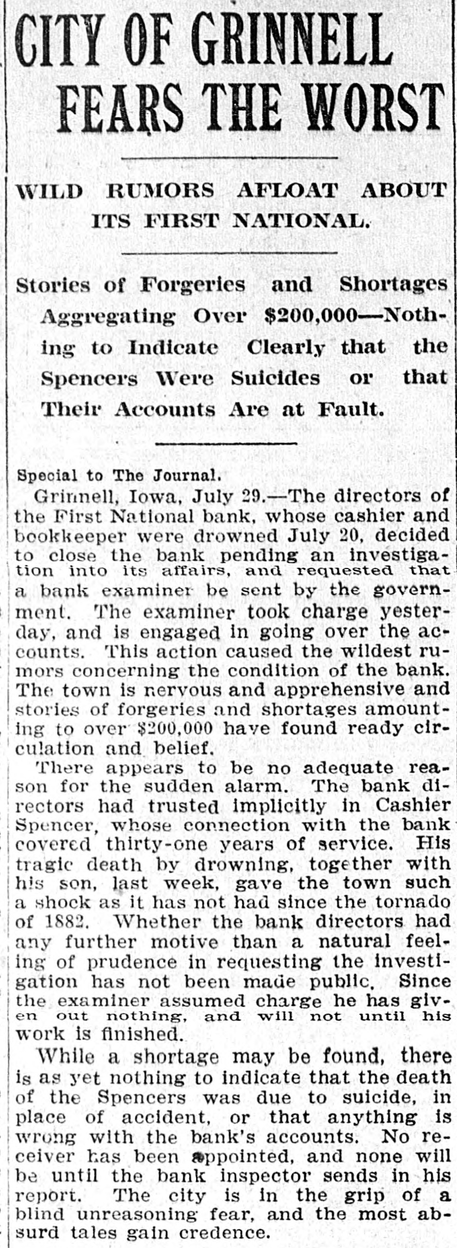THE NEWS IN BRIEF. For the Week Ending Aug. 1. Chicago is to be the democratic headquarters for the campaign in the west. The commercial treaty between Germany and Russia has been signed. Minister Leischmann insists that the sultan shall give protection to American schools in Armenia. Troops will be sent to Bonesteel to remain during the land filing from August 8 to September 10. Albert Phillips, aged 42, a labor leader, was fatally crushed at Wooley's mine, at Booneville, Ind. The state department awaits Minister Bowen's report before it acts on the Venezuelan asphalt seizure. Fire in an immoral resort at Nashwauk, on the Minnesota iron range, burned three persons to death. Twelve business houses were destroyed by fire at Mora, Minn., causing a loss estimated at about $70,000. A fire at Salisbury, Md., destroyed the mill and lumber yard of E. S. Adkins & Co., resulting in a loss of $40,000. The associated banks of New York make a favorable statement, showing $5,380,000 increase in the surplus reserve. The people of Great Britain are face to face with hard times, with no money in circulation and all business in a condition of stagnation. The house of John Harper, at New Haven, in Hamilton county, O., burned, and Mr. Harper and his wife, both over 80 years old. were burned to death. During a heavy rain at Elizabeth, N. J., Patrick Meckeesey, 60 years old, employed by the city, was drowned in a sewer which he was engaged in cleaning. F. A. La Roche reached Chicago from New York in an automobile endurance test, his machine having run 1,200 miles in 120 hours without stopping. Mrs. Minnie C. Love, of Chicago, was given a decree of absolute divorce from Sidney C. Love, with $50,000 alimony, $25,000 of which was paid in court. The death of John Rogers, sculptor and designer of the famous "Rogers groups" of statuary, is announced. It occurred at his summer home in New Canaan, Conn. Henry R. Hodges, his wife and three children, living about six miles from Statesboro, have been killed and their home burned. Robbery is supposed to have been the cause of the crime. -President Roosevelt told a committee of the National Grange that he would allow the organization to select the successor of the late J. H. Brigham as assistant secretary of agriculture. J. H. Murley, of Denison, Tex., a freight train brakeman, who recently inherited $30,000, and who was making his last trip as brakeman, fell under the wheels of his train and was killed. The comptroller of the currency has appointed E. B. Shaw, a national bank examiner, as receiver of the First national bank, of Grinnell, Ia., whose doors were closed by the directors Tuesday. Gov. Peabody, in a statement, defends his use of the militia in the Cripple Creek region, blaming the miners' union for crimes and holding that a vigorous policy was absolutely necessary. Samuel H. Cordell, an insurance agent, of Dallas, Tex., shot and killed his wife while she was asleep. Cordell then shot himself through the head, dying instantly. Jealousy is given as the cause. Gen. Leonard Wood, commanding the department of Mindanao, Philippines, has taken steps to have swimming taught the soldiers of his command as the result of numerous accidents in the water. Postmaster General Payne has given ten days' leave of absence to all postmasters at all first-class offices to attend the annual convention of the National Association of Postmasters at Niagara Falls, August 22-25. Capt. Van Schaick and Federal Steamboat Inspector Fleming and Former Inspector Lundberg were indicted in New York by the federal grand jury in connection with the disaster to the General Slocum on June 15 last when nearly 1.000 lives were