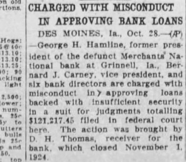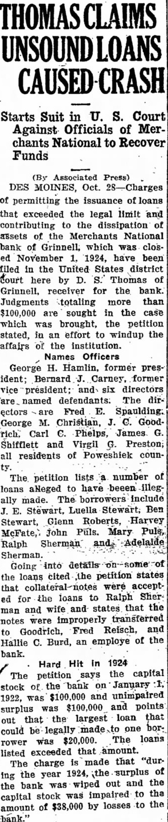 Starts Suit in Court Against Officials of Merchants National to Recover Funds (By Associated Press) DES MOINES, Oct. of permitting the issuance of loans that exceeded the legal limit and contributing to the dissipation of assets of the Merchants National bank of Grinnell, which was closed November 1924, have been filed in the United States district here by D. Thomas of Grinnell, receiver for the bank. Judgments totaling more than $100,000 are sought in the case which was brought, the petition stated, in an effort to windup the affairs of the institution. Names Officers George H. Hamlin, former president; Bernard Carney, former vice president; and six directors named The dirare. ectors Fred E. Spaulding. George M. Christian, G. Goodrich. Carl C. Phelps, James Shifflett and Virgil all residents of Poweshiek coun- The petition lists number of loans aNeged to have beeen illegally made. The borrowers include Stewart, Luella Stewart, Ben Stewart, Glenn Roberts, Harvey John Puls. Mary Puls, McFate, Sherman and Adelaide Ralph Sherman. Going into details cited the petition states the loans that were acceptloans to Ralph Sher ed for the and states that the and wife improperly transferred notes were Fred Reisch, and to Goodrich, Hallie C. Burd, an employe of the bank. Hard Hit in 1924 the capital The petition says the bank January stock of and unimpaired 1922, was $100,000 and points surplus was the largest loan that that one borcould be legally The loans was $20,000. exceeded that amount. listed made that "durThe charge surplus of the year the out and the bank was wiped impaired to the capital stock was by losses to the amount of $38,000