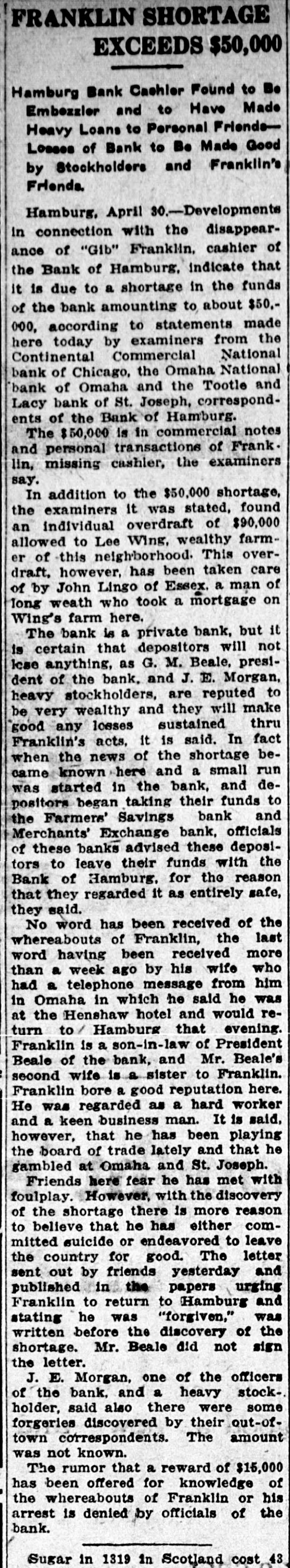 FRANKLIN SHORTAGE EXCEEDS $50,000 Hamburg Bank Cashier Found to Be Embezzier and to Have Made Heavy Loans to Personal FriendsLosses of Bank to Be Made Good by Stockholders and Franklin's Friends. Hamburg, April 30.-Developments in connection with the disappearance of "Gib" Franklin, cashier of the Bank of Hamburg, indicate that it is due to a shortage in the funds of the bank amounting to about $50.000, according to statements made here today by examiners from the Continental Commercial National bank of Chicago, the Omaha National bank of Omaha and the Tootle and Lacy bank of St. Joseph, correspondents of the Bank of Hamburg. The $50,000 is in commercial notes and personal transactions of Frank. lin, missing cashier, the examiners say. In addition to the $50,000 shortage, the examiners it was stated, found an individual overdraft of $90,000 allowed to Lee Wing, wealthy farmer of this neighborhood. This overdraft, however, has been taken care of by John Lingo of Essex. a man of long weath who took a mortgage on Wing's farm here. The bank is a private bank, but it is certain that depositors will not lese anything, as G. M. Beale, president of the bank, and J. E. Morgan, heavy stockholders, are reputed to be very wealthy and they will make good any losses sustained thru Franklin's acts, it is said. In fact when the news of the shortage became known here and a small run was started in the bank, and depositors began taking their funds to the Farmers' Savings bank and Merchants' Exchange bank, officials of these banks advised these depositors to leave their funds with the Bank of Hamburg, for the reason that they regarded it as entirely safe, they said. No word has been received of the whereabouts of Franklin, the last word having been received more than a week ago by his wife who had a telephone message from him in Omaha in which he said he was at the Henshaw hotel and would return to / Hamburg that evening. Franklin is a son-in-law of President Beale of the bank, and Mr. Beale's second wife is a sister to Franklin. Franklin bore a good reputation here. He was regarded as a hard worker and a keen business man. It is said, however, that he has been playing the board of trade lately and that he gambled at Omaha and St. Joseph. Friends here fear he has met with foulplay. However, with the discovery of the shortage there is more reason to believe that he has either committed suicide or endeavored to leave the country for good. The letter sent out by friends yesterday and published in the papers urging Franklin to return to Hamburg and stating he was "forgiven," was written before the discovery of the shortage. Mr. Beale did not sign the letter. J. E. Morgan, one of the officers of the bank, and a heavy stockholder, said also there were some forgeries discovered by their out-oftown correspondents. The amount was not known. The rumor that a reward of $15,000 has been offered for knowledge of the whereabouts of Franklin or his arrest is denied by officials of the bank. Sugar in 1319 in Scotland cost 43