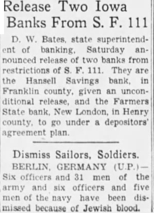 Release Two Iowa Banks From D. W. Bates. state superintendent of banking. Saturday announced release two banks restrictions of They are the Hansell Savings bank, in Franklin county. an unconditional release, and the Farmers State bank. New London, in Henry county, to go under a depositors agreement plan. Dismiss Sailors, Soldiers. BERLIN, GERMANY Six officers and 31 men of the army and six officers and five the navy have been dis[missed because of Jewish blood.