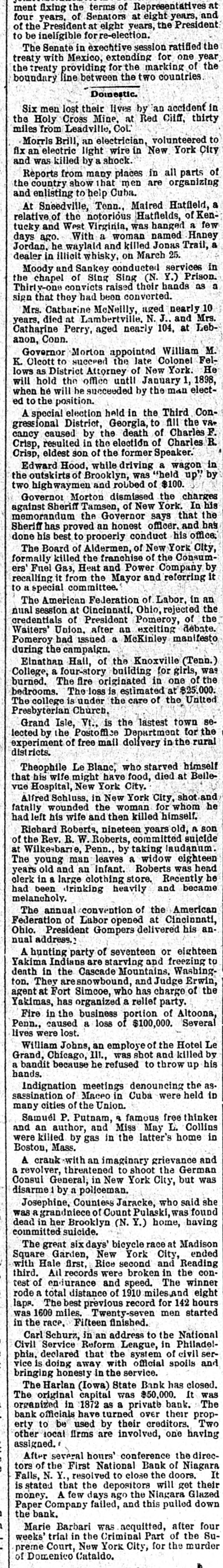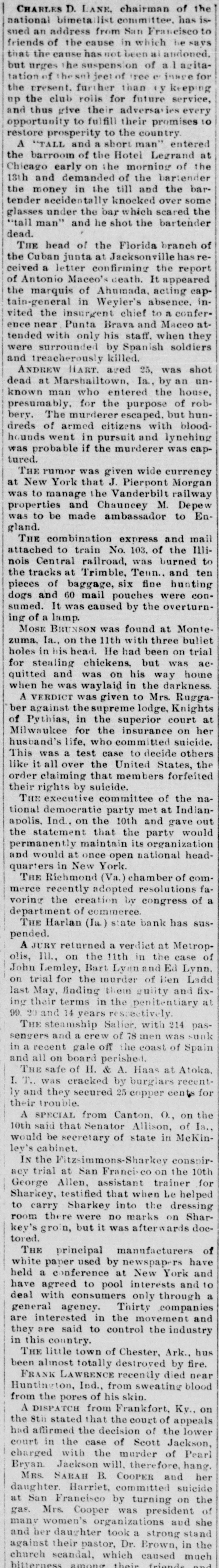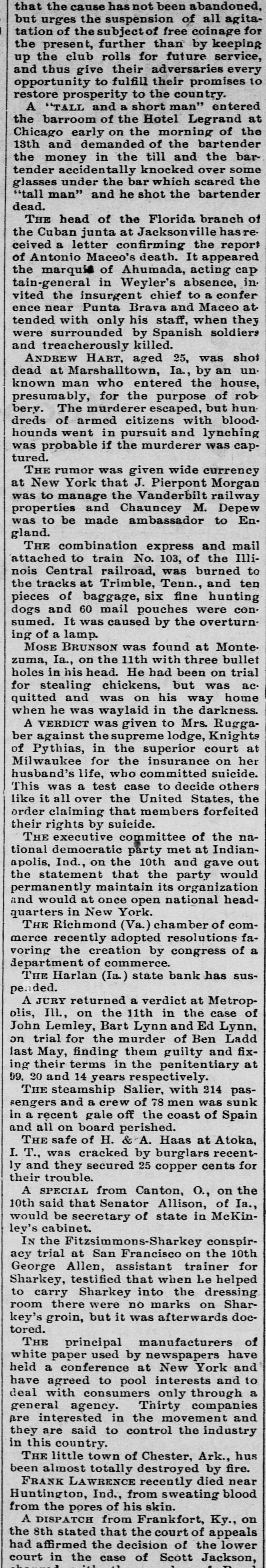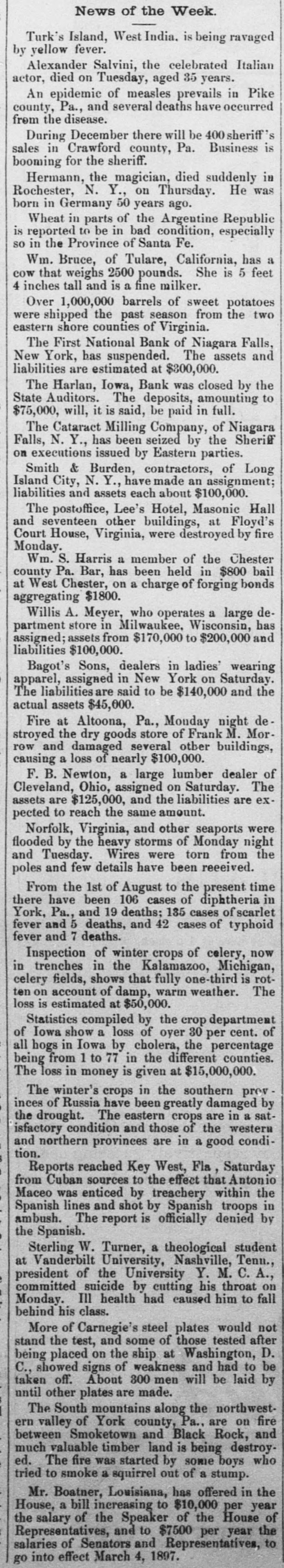 News of the Week. Turk's Island, West India. is being ravaged by yellow fever. Alexander Salvini, the celebrated Italian actor, died on Tuesday, aged 35 years. An epidemic of measles prevails in Pike county, Pa., and several deaths have occurred from the disease. During December there will be 400 sheriff's sales in Crawford county, Pa. Business is booming for the sheriff. Hermann, the magician, died suddenly in Rochester, N. Y., on Thursday. He was born in Germany 50 years ago. Wheat in parts of the Argentine Republic is reported to be in bad condition, especially so in the Province of Santa Fe. Wm. Bruce, of Tulare, California, has a cow that weighs 2500 pounds. She is 5 feet 4 inches tall and is a fine milker. Over 1,000,000 barrels of sweet potatoes were shipped the past season from the two eastern shore counties of Virginia. The First National Bank of Niagara Falls, New York, has suspended. The assets and liabilities are estimated at $800,000. The Harlan, Iowa, Bank was closed by the State Auditors. The deposits, amounting to $75,000, will, it is said, be paid in full. The Cataract Milling Company, of Niagara Falls, N. Y., has been seized by the Sheriff on executions issued by Eastern parties. Smith & Burden, contractors, of Long Island City, N. Y., have made an assignment; liabilities and assets each about $100,000. The postoffice, Lee's Hotel, Masonic Hall and seventeen other buildings, at Floyd's Court House, Virginia, were destroyed by fire Monday. Wm. S. Harris a member of the Chester county Pa. Bar, has been held in $800 bail at West Chester, on a charge of forging bonds aggregating $1800. Willis A. Meyer, who operates a large department store in Milwaukee, Wisconsin, has assigned; assets from $170,000 to $200,000 and liabilities $100,000. Bagot's Sons, dealers in ladies' wearing apparel, assigned in New York on Saturday. The liabilities are said to be $140,000 and the actual assets $45,000. Fire at Altoona, Pa., Monday night de stroyed the dry goods store of Frank M. Morrow and damaged several other buildings, causing a loss of nearly $100,000. F. B. Newton, a large lumber dealer of Cleveland, Ohio, assigned on Saturday. The assets are $125,000, and the liabilities are expected to reach the same amount. Norfolk, Virginia, and other seaports were flooded by the heavy storms of Monday night and Tuesday. Wires were torn from the poles and few details have been received. From the 1st of August to the present time there have been 106 cases of diphtheria in York, Pa., and 19 deaths; 135 cases of scarlet fever and 5 deaths, and 42 cases of typhoid fever and 7 deaths. Inspection of winter crops of colery, now in trenches in the Kalamazoo, Michigan, celery fields, shows that fully one-third is rotten on account of damp, warm weather. The loss is estimated at $50,000. Statistics compiled by the crop department of Iowa show a loss of over 30 per cent. of all hogs in Iowa by cholera, the percentage being from 1 to 77 in the different counties. The loss in money is given at $15,000,000. The winter's crops in the southern prov inces of Russia have been greatly damaged by the drought. The eastern crops are in a satisfactory condition and those of the western and northern provinces are in a good condition. Reports reached Key West, Fla, Saturday from Cuban sources to the effect that Antonio Maceo was enticed by treachery within the Spanish lines and shot by Spanish troops in ambush. The report is officially denied by the Spanish. Sterling W. Turner, a theological student at Vanderbilt University, Nashville, Tenn., president of the University Y. M. C. A., committed suicide by cutting his throat on Monday. Ill health had caused him to fall behind his class. More of Carnegie's steel plates would not stand the test, and some of those tested after being placed on the ship at Washington, D. C., showed signs of weakness and had to be taken off. About 300 men will be laid by until other plates are made. The South mountains along the northwestern valley of York county, Pa., are on fire between Smoketown and Black Rock, and much valuable timber land is being destroyed. The fire was started by some boys who tried to smoke a squirrel out of a stump. Mr. Boatner, Louisiana, has offered in the House, a bill increasing to $10,000 per year the salary of the Speaker of the House of Representatives, and to $7500 per year the salaries of Senators and Representatives, to go into effect March 4, 1897.
