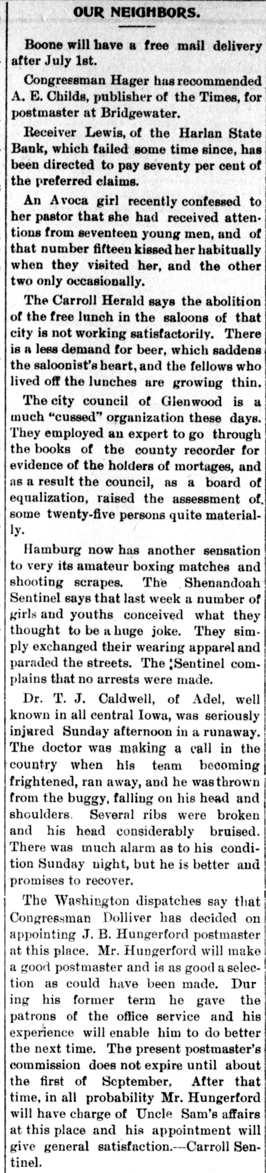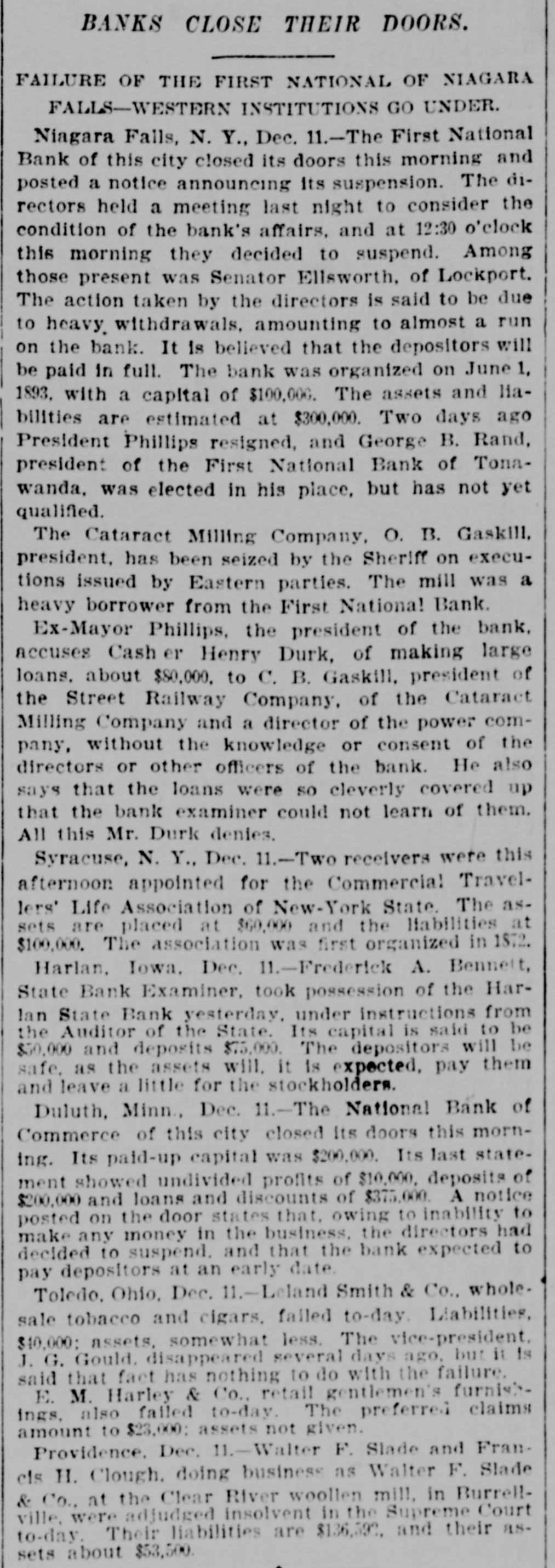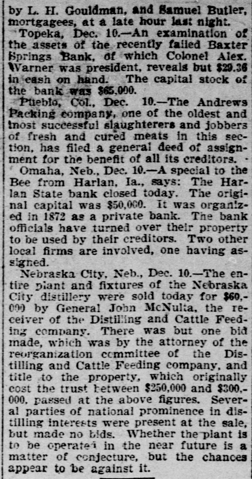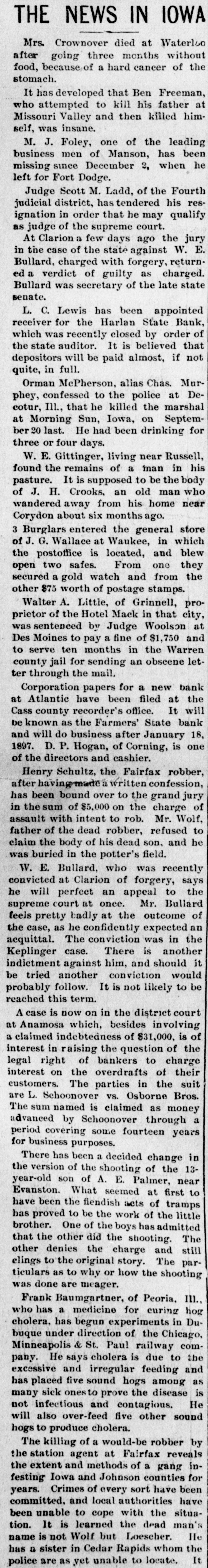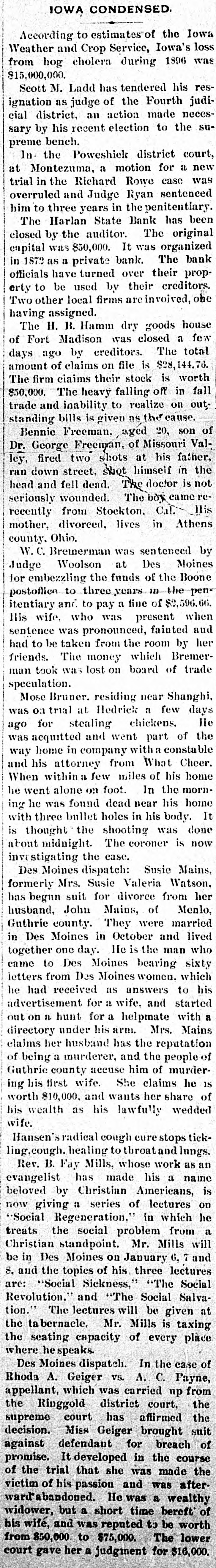News of the Week. Turk's Island, West India. is being ravaged by yellow fever. Alexander Salvini, the celebrated Italian actor, died on Tuesday, aged 35 years. An epidemic of measles prevails in Pike county, Pa., and several deaths have occurred from the disease. During December there will be 400 sheriff's sales in Crawford county, Pa. Business is booming for the sheriff. Hermann, the magician, died suddenly in Rochester, N. Y., on Thursday. He was born in Germany 50 years ago. Wheat in parts of the Argentine Republic is reported to be in bad condition, especially so in the Province of Santa Fe. Wm. Bruce, of Tulare, California, has a cow that weighs 2500 pounds. She is 5 feet 4 inches tall and is a fine milker. Over 1,000,000 barrels of sweet potatoes were shipped the past season from the two eastern shore counties of Virginia. The First National Bank of Niagara Falls, New York, has suspended. The assets and liabilities are estimated at $800,000. The Harlan, Iowa, Bank was closed by the State Auditors. The deposits, amounting to $75,000, will, it is said, be paid in full. The Cataract Milling Company, of Niagara Falls, N. Y., has been seized by the Sheriff on executions issued by Eastern parties. Smith & Burden, contractors, of Long Island City, N. Y., have made an assignment; liabilities and assets each about $100,000. The postoffice, Lee's Hotel, Masonic Hall and seventeen other buildings, at Floyd's Court House, Virginia, were destroyed by fire Monday. Wm. S. Harris a member of the Chester county Pa. Bar, has been held in $800 bail at West Chester, on a charge of forging bonds aggregating $1800. Willis A. Meyer, who operates a large department store in Milwaukee, Wisconsin, has assigned; assets from $170,000 to $200,000 and liabilities $100,000. Bagot's Sons, dealers in ladies' wearing apparel, assigned in New York on Saturday. The liabilities are said to be $140,000 and the actual assets $45,000. Fire at Altoona, Pa., Monday night de stroyed the dry goods store of Frank M. Morrow and damaged several other buildings, causing a loss of nearly $100,000. F. B. Newton, a large lumber dealer of Cleveland, Ohio, assigned on Saturday. The assets are $125,000, and the liabilities are expected to reach the same amount. Norfolk, Virginia, and other seaports were flooded by the heavy storms of Monday night and Tuesday. Wires were torn from the poles and few details have been received. From the 1st of August to the present time there have been 106 cases of diphtheria in York, Pa., and 19 deaths; 135 cases of scarlet fever and 5 deaths, and 42 cases of typhoid fever and 7 deaths. Inspection of winter crops of colery, now in trenches in the Kalamazoo, Michigan, celery fields, shows that fully one-third is rotten on account of damp, warm weather. The loss is estimated at $50,000. Statistics compiled by the crop department of Iowa show a loss of over 30 per cent. of all hogs in Iowa by cholera, the percentage being from 1 to 77 in the different counties. The loss in money is given at $15,000,000. The winter's crops in the southern prov inces of Russia have been greatly damaged by the drought. The eastern crops are in a satisfactory condition and those of the western and northern provinces are in a good condition. Reports reached Key West, Fla, Saturday from Cuban sources to the effect that Antonio Maceo was enticed by treachery within the Spanish lines and shot by Spanish troops in ambush. The report is officially denied by the Spanish. Sterling W. Turner, a theological student at Vanderbilt University, Nashville, Tenn., president of the University Y. M. C. A., committed suicide by cutting his throat on Monday. Ill health had caused him to fall behind his class. More of Carnegie's steel plates would not stand the test, and some of those tested after being placed on the ship at Washington, D. C., showed signs of weakness and had to be taken off. About 300 men will be laid by until other plates are made. The South mountains along the northwestern valley of York county, Pa., are on fire between Smoketown and Black Rock, and much valuable timber land is being destroyed. The fire was started by some boys who tried to smoke a squirrel out of a stump. Mr. Boatner, Louisiana, has offered in the House, a bill increasing to $10,000 per year the salary of the Speaker of the House of Representatives, and to $7500 per year the salaries of Senators and Representatives, to go into effect March 4, 1897.