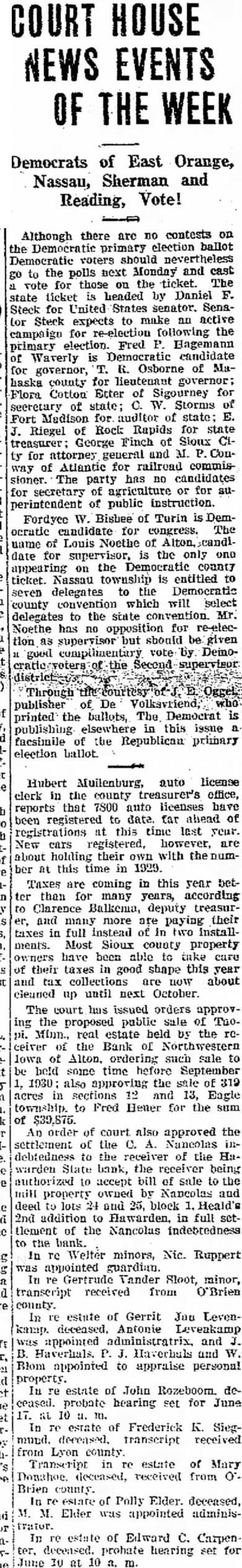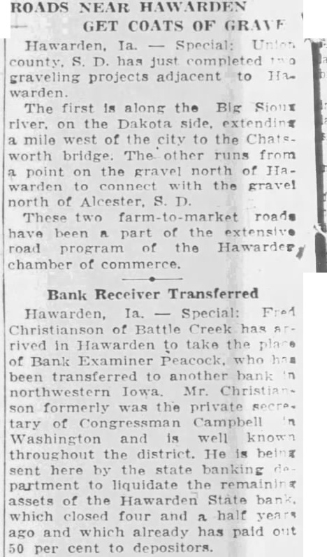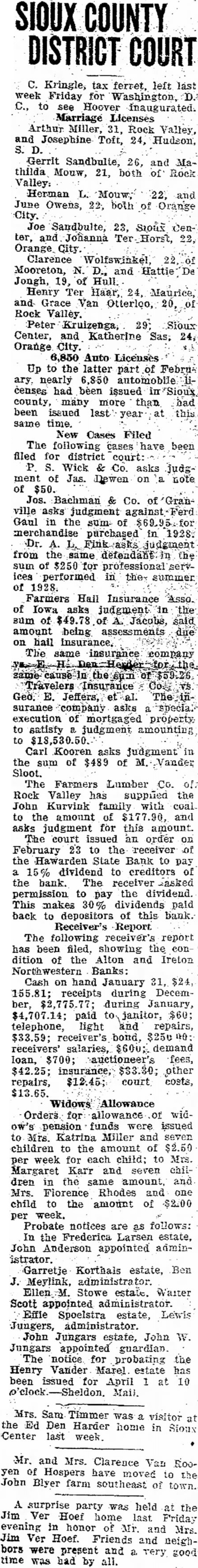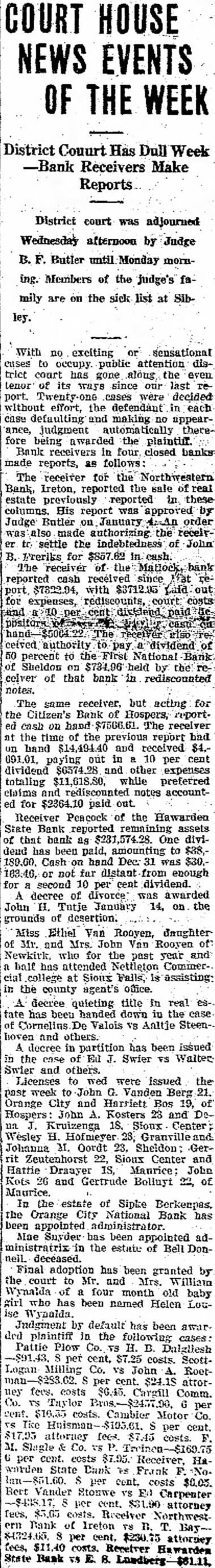 L A. Andrew, receiver of the Hawarden State Bank, brings an action against Sioux county and A. Balkema, Treasurer, asking to have the taxes declared not a lien on property in hands of the receiver, and taxes assessed to A. H. Ring be declared not a lien on lots 7, 8 and 9, block 30, Calliope, now a part of Hawarden.
