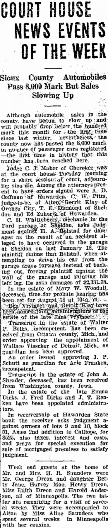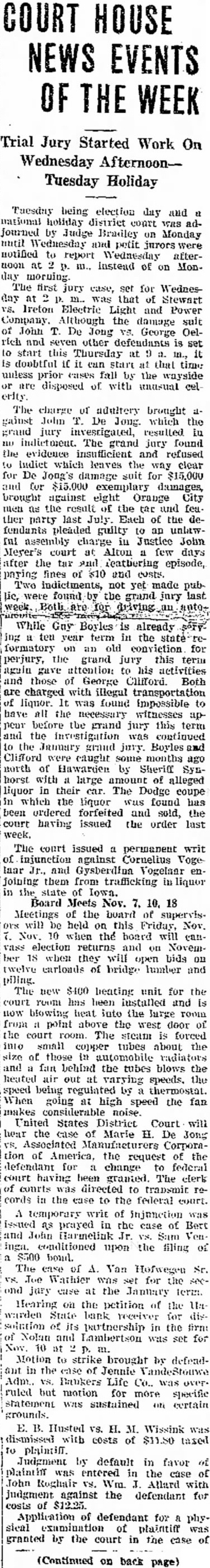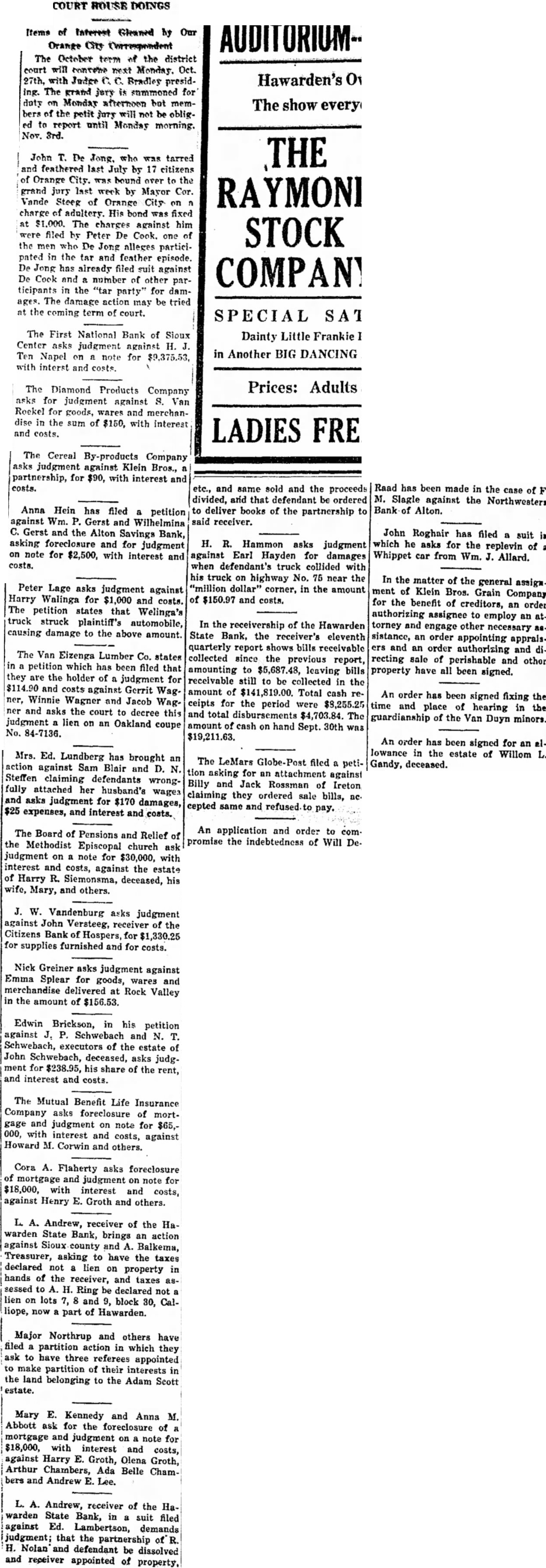 John T. De Jong. who was tarred and feathered last July by 17 citizens of Orange City. was bound over to the grand jury last week by Mayor Cor. Vande Steeg of Orange City on n charge of adultery. His bond was fixed at $1,000. The charges against him were filed by Peter De Cook. one of the men who De Jong alleges participated in the tar and feather episode. De Jong has already filed suit against De Cook and a number of other participants in the "tar party" for damages. The damage action may be tried at the coming term of court.