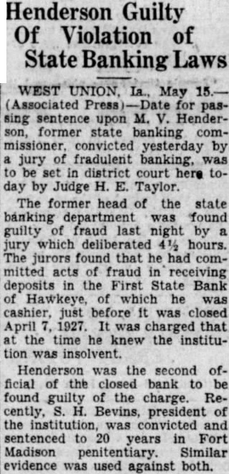 Henderson Guilty Of Violation of State Banking Laws WEST UNION. May (Associated for passing sentence upon Henderformer state banking commissioner. convicted yesterday by jury of fradulent banking, set district court here today by Judge H. Taylor. The former head of the state banking department was found guilty fraud last night which deliberated hours. The jurors found that he had mitted acts of fraud in receiving deposits the First State Bank Hawkeye, which he cashier, just before was closed 1927. charged that the time he knew the institution was insolvent. Henderson was the second ficial of the closed bank to found guilty of the charge. Recently, Bevins, president of the institution, was convicted and sentenced to 20 years in Fort Madison penitentiary. Similar evidence was used against both.