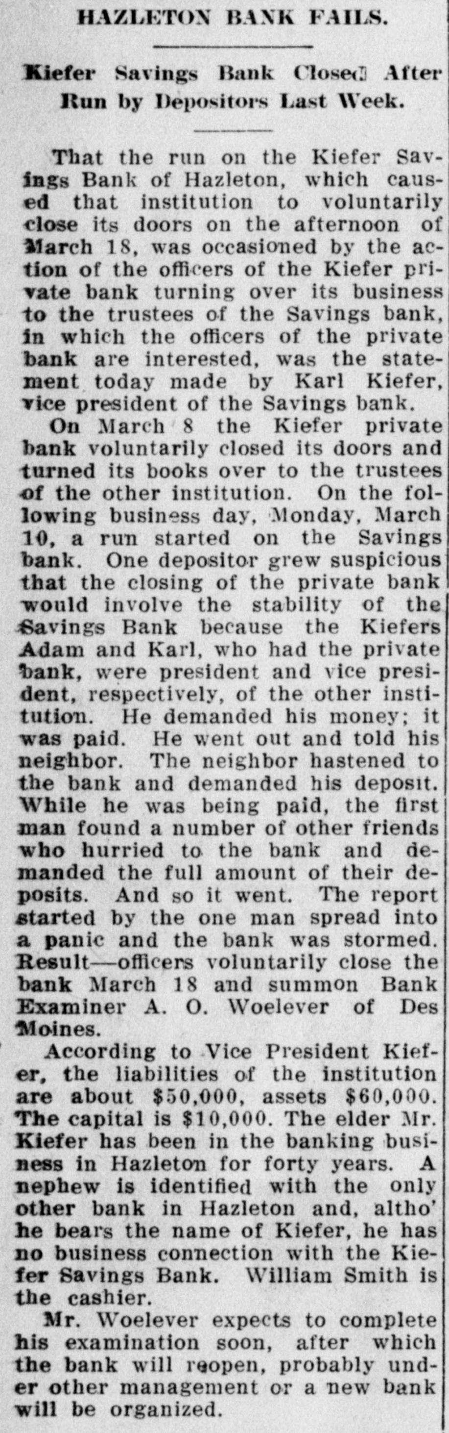 HAZLETON BANK FAILS. Kiefer Savings Bank Closed After Run by Depositors Last Week. That the run on the Kiefer Savings Bank of Hazleton, which caused that institution to voluntarily close its doors on the afternoon of March 18, was occasioned by the action of the officers of the Kiefer private bank turning over its business to the trustees of the Savings bank, in which the officers of the private bank are interested, was the statement today made by Karl Kiefer, vice president of the Savings bank. On March 8 the Kiefer private bank voluntarily closed its doors and turned its books over to the trustees of the other institution. On the following business day, Monday, March 10, a run started on the Savings bank. One depositor grew suspicious that the closing of the private bank would involve the stability of the Savings Bank because the Kiefers Adam and Karl, who had the private bank, were president and vice president, respectively, of the other institution. He demanded his money; it was paid. He went out and told his neighbor. The neighbor hastened to the bank and demanded his deposit. While he was being paid, the first man found a number of other friends who hurried to the bank and demanded the full amount of their deposits. And so it went. The report started by the one man spread into a panic and the bank was stormed. Result-officers voluntarily close the bank March 18 and summon Bank Examiner A. O. Woelever of Des Moines. According to Vice President Kiefer, the liabilities of the institution are about $50,000, assets $60,000. The capital is $10,000. The elder Mr. Kiefer has been in the banking business in Hazleton for forty years. A nephew is identified with the only other bank in Hazleton and, altho' he bears the name of Kiefer, he has no business connection with the Kiefer Savings Bank. William Smith is the cashier. Mr. Woelever expects to complete his examination soon, after which the bank will reopen, probably under other management or a new bank will be organized.