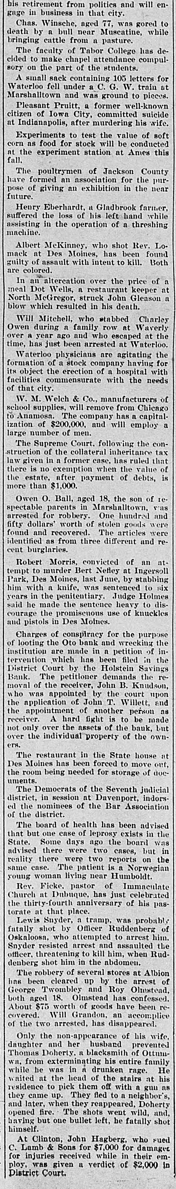 retirement from politics and will enin business in that city. Chas. Winsche, aged 77, was gored to by a bull near Muscatine, while nging cattle from a pasture. The faculty of Tabor College has deto make chapel attendance compulon the part of the students. small sack containing 105 letters for aterloo fell under a C. G. W. train at rshalltown and was ground to pieces. Pleasant Pruitt, a former well-known izen of Iowa City, committed suicide Indianapolis, after murdering his wife. Experiments to test the value of soft as food for stock will be conducted the experiment station at Ames this The poultrymen of Jackson County formed an association for the purof giving an exhibition in the near ure. Henry Eberhardt, at Gladbrook farmer, fered the loss of his left hand while sisting in the operation of a threshing chine. Albert McKinney, who shot Rev. Loat Des Moines, has been found of assault with intent to kill. Both colored. In an altercation over the price of a Dot Wells, a restaurant keeper at McGregor, struck John Gleason a which resulted in his death. Will Mitchell, who stabbed Charley during a family row at Waverly a year ago and who escaped at the has just been arrested at Waterloo. Vaterloo physicians are agitating the mation of a stock company having for object the erection of a hospital with ilities commensurate with the needs that city. M. Welch & Co., manufacturers of supplies, will remove from Chicago Anamosa. The company has a capitalof $200,000, and will employ a number of men. The Supreme Court. following the conof the collateral inheritance tax given in a former case, has ruled that is no exemption when the value of estate, after payment of debts, is than $1,000. Owen O. Ball, aged 18, the son of reectable parents in Marshalltown, was rested for robbery. One hundred and dollars' worth of stolen goods were and and recovered. The articles were ntified as from three different and reburglaries. Robert Morris, convicted of an atto murder Bert Nefley at Ingersoll Des Moines, last June, by stabbing with a knife, was sentenced to six in the penitentiary. Judge Holmes he made the sentence heavy to disthe promiseuous use of knuckles pistols in Des Moines. Charges of conspiracy for the purpose looting the Oto bank and wrecking the titution are made in a petition of invention which has been filed in the strict Court by the Holstein Savings The petitioner demands the reof the receiver, John B. Knudson, was appointed by the court upon application of John T. Willett, and appointment of another person as A hard fight is to be made only over the assets of the bank, but the individual property of the ownThe restaurant in the State house at Moines has been forced to move out, room being needed for storage of docents. The Democrats of the Seventh judicial trict, in session at Davenport, indorsthe nominees of the Bar Association the district. The board of health has been advised but one case of lenrosy oristo
