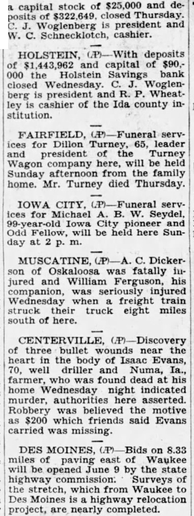 a capital stock of $25,000 and deposits of $322,649. closed Thursday. C. J. Woglenberg is president and W. C. Schnecklotch, cashier. HOLSTEIN, With deposits of $1,443,962 and capital of $90,000 the Holstein Savings bank closed Wednesday. C. J. Woglenberg is president and R. P. Wheatley is cashier of the Ida county institution. FAIRFIELD, (P)-Funeral services for Dillon Turney, 65, leader and president of the Turney Wagon company here, will be held Sunday afternoon from the family home. Mr. Turney died Thursday. IOWA CITY. (P)-Funeral services for Michael A. B. W. Seydel, 99-year-old Iowa City pioneer and Odd Fellow, will be held here Sunday at 2 m. MUSCATINE, (P)-A. C. Dickerson of Oskaloosa was fatally injured and William Ferguson, his companion, was seriously injured Wednesday when a freight train struck their truck eight miles south of here. of three bullet wounds near the heart in the body of Isaac Evans, 70, well driller and Numa, Ia., farmer, who was found dead at his home Wednesday night indicated murder, authorities here asserted. Robbery was believed the motive as $200 which friends said Evans carried was missing. DES MOINES. on 8.33 miles of paving east of Waukee will be opened June 9 by the state highway commission. Surveys of the stretch, which from Waukee to Des Moines is highway relocation project, are nearly completed.