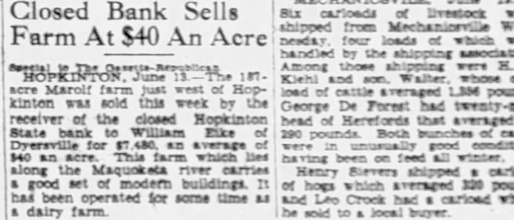 Closed Bank Sells Farm At $40 An Acre Marolf kinton was sold this week De Forest George receiver of the closed Hopkinton head that State William average an This lies along the river carries good of modern buildings. been operated for some time and carload dairy