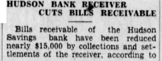 Bills receivable of the Hudson Savings bank have been reduced nearly $15 by collections and settlements of the receiver.