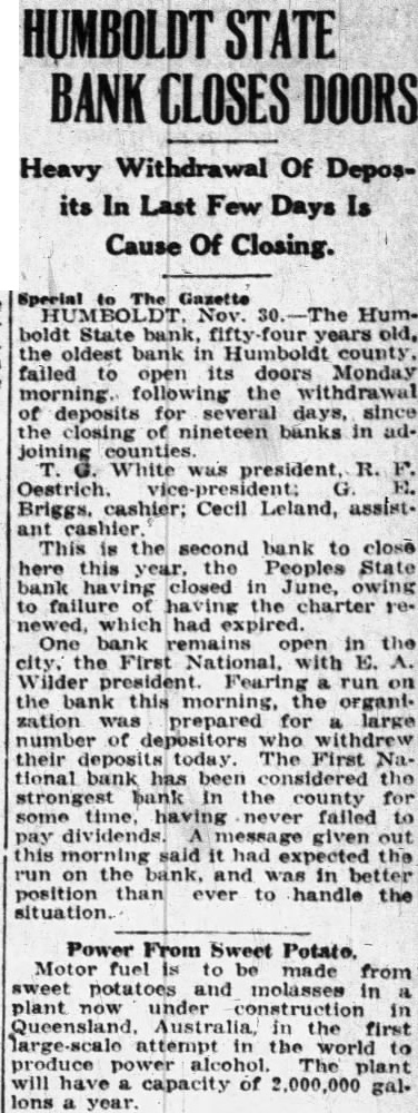 HUMBOLDT STATE BANK CLOSES DOORS Heavy Withdrawal Of Deposits In Last Few Days Is Cause Of Closing. Special The HUMBOLDT Nov. Humboldt State bank, fifty old, the oldest bank in Humboldt county. failed to open its doors Monday morning. following the withdrawal of deposits for several days, since the closing of nineteen banks in adjoining counties T. G. White was president, R. Briggs. cashier; Cecil Leland, assist. ant cashier This is the second bank to close here this year. the Peoples State bank closed in June, owing to failure having the charter renewed, which had expired. One bank remains open in the city, the First National, with E. Wilder president. Fearing run on the bank this morning, the organi. zation prepared for large number of depositors who withdrew their deposits today. The First Na. tional bank has been considered the strongest the county for some time, having never failed to pay dividends message given out this morning said it had expected the run on the bank. and was in better position than ever to handle the situation. Power From Sweet Potate. Motor fuel to made from sweet potatoes molasses in plant now under construction in Queensland. Australia, the first large-scale attempt in the world to produce power The plant will have capacity of 2,000,000 gal. lons year.