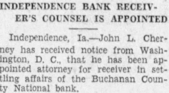 INDEPENDENCE BANK RECEIVER'S COUNSEL IS APPOINTED Independence, Ia.-John L. Cherney has notice from Washington, D. C., that he has been appointed attorney for receiver in settling affairs the Buchanan County National bank.