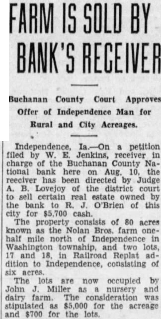 FARM IS BY BANK'S RECEIVER Buchanan County Court Approves Offer of Independence Man for Rural and City Acreages. Independence, Ia.-On a petition filed by W. E. Jenkins, receiver in charge of the Buchanan County National bank here on Aug. 10, the reeciver has been directed by Judge A. B. Lovejoy the district court to sell certain real estate owned by the bank R. O'Brien of this city for $5,700 cash. The property consists of 80 acres known as the Nolan Bros. farm onehalf mile north of Independence in Washington township, and two lots, 17 and 18. in Railroad Replat addition to Independence, consisting of six acres The lots are now occupied by John Miller as nursery and dairy farm. The consideration was stipulated as $5,000 for the acreage and $700 for the lots.