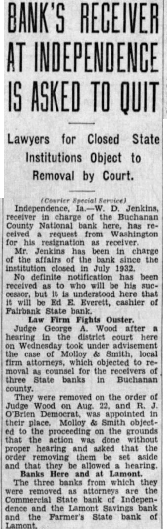 BANK'S RECEIVER INDEPENDENCE IS ASKED TO QUIT Lawyers for Closed State Institutions Object to Removal by Court. (Courier Special Independence, Ia.-W. D. Jenkins, receiver in charge of the Buchanan County National bank here, has received request from Washington for his resignation as receiver. Mr. Jenkins has been in charge of the affairs of the bank since the closed in July 1932. No definite has been as to who will be his successor, but here that will be Ed Everett, cashier of Fairbank State bank. Law Firm Fights Ouster. Judge George Wood after a hearing in the district court here on Wednesday took under advisement the case of Molloy Smith, local firm attorneys, which objected to removal as counsel for the receivers of three State banks in Buchanan county. They were removed on the order of Judge Wood on Aug. 22, and R. J. O'Brien Democrat, was appointed in their place. Molloy & Smith objected to the proceeding on the grounds that the action was done without proper hearing and asked that the order removing them be set aside and that they be allowed hearing Banks Here and at Lamont. The three banks from which they were as attorneys are the bank of Independence and the Lamont Savings bank and the Farmer's State bank of Lamont.