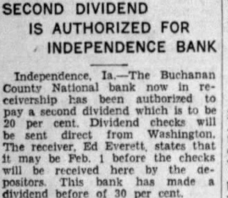 SECOND DIVIDEND IS AUTHORIZED FOR BANK Independence, Buchanan County National bank ceivership has been authorized to second dividend which is to cent. Dividend checks will per sent direct from The Ed states that it be Feb. before the checks will received here by the depositors. This bank has made dividend before of per cent.