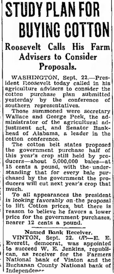 BUYING COTTON Roosevelt Calls His Farm Advisers to Consider Proposals. Sept. ident Roosevelt today called in advisers consider the cotton purchase plan submitted yesterday by the conference southern Those summoned secretary Wallace and George Peek, the ministrator the agricultural justment act, and Senator Bankhead Alabama, leader in the cotton conference. The cotton belt states proposed the government purchase half of this year's crop still held by 15 cents pound, with the understanding that for every bale chased by the government the ducers will cut next year's crop that much. To all appearances the president looking favorably the proposal to lift Cotton prices, but there reason to believe he favors lower price for the purchases, nearer 12 cents pound. Named Bank Receiver. Sept. Everett, democrat, was appointed W. Jenkins, republican, as receiver for the Farmers National bank of Vinton and the Buchanan County National bank Independence
