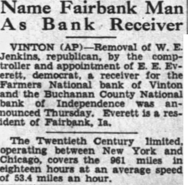 Name Fairbank Man As Bank Receiver VINTON Removal of W. E. Jenkins, republican, by the comptroller and appointment of E. E. Everett, democrat, a receiver for the Farmers National bank of Vinton and the Buchanan County National bank of Independence was announced Thursday. Everett is a resident of Fairbank, Ia. The Twentieth Century limited, operating between New York and Chicago, covers the 961 miles in eighteen hours at an average speed of 53.4 miles an hour.