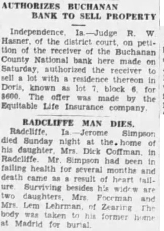 AUTHORIZES BUCHANAN BANK TO SELL PROPERTY Independence R. W Hasner, of the district court, on petiof the receiver of the Buchanan County National bank here made authorized the receiver residence thereon Doris, known block for $600. offer was made by the Equitable Life Insurance company. RADCLIFFE MAN DIES. Simpson died Sunday night his daughter Mrs. Dick Mr had been failing health for several months and death came result heart Surviving besides Mrs and Lem Zearing body taken former Madrid for