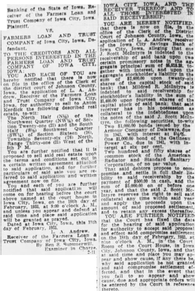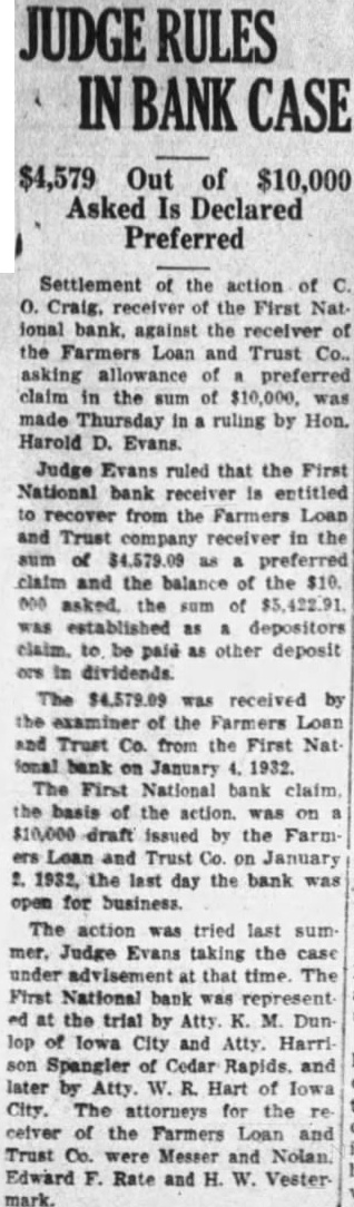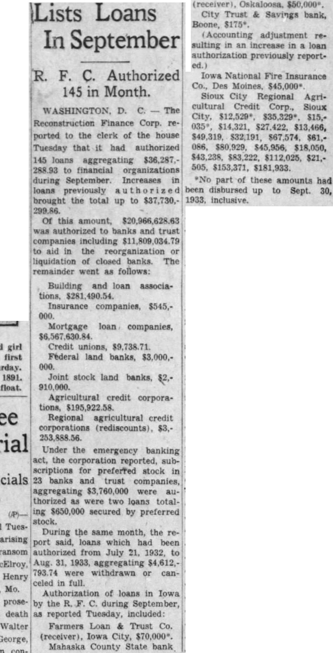 Mortgage loan companies, $6,567,630.84 Credit unions, $9,738.71 Federal land banks, $3,000,000. Joint stock land banks, $2,910,000. Agricultural credit corporations, $195,922.58 Regional agricultural credit corporations (rediscounts), $3,253,888.56 Under the emergency banking act, the corporation reported, subscriptions for preferred stock in 23 banks and trust companies, aggregating $3,760,000 were authorized as were two loans totaling $650,000 secured by preferred stock. During the same month, the report said, loans which had been authorized from July 21, 1932, to Aug. 31, 1933, aggregating $4,612,793.74 were withdrawn or can celed in full. Authorization of loans in Iowa by the R. C. during September, as reported Tuesday, included: Farmers Loan & Trust Co. (receiver), Iowa City, $70,000*. Mahaska County State bank