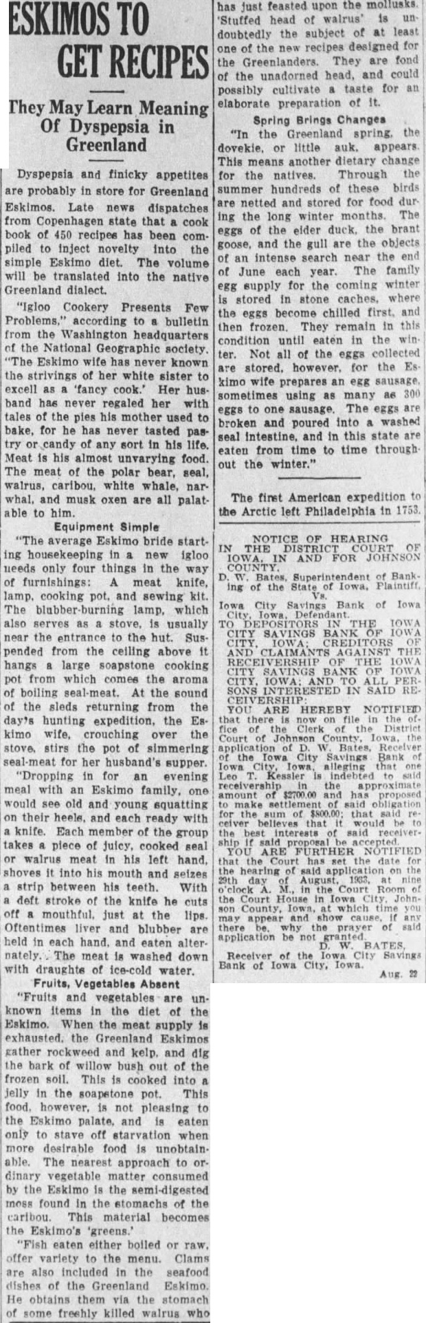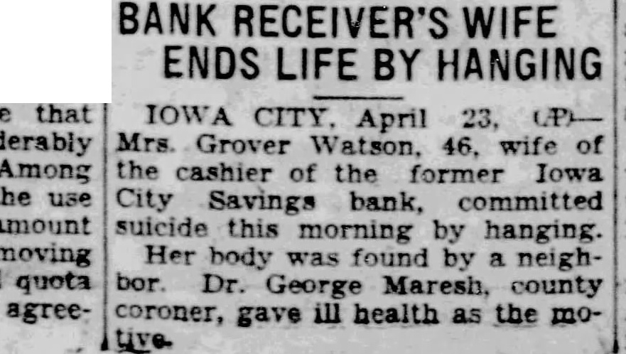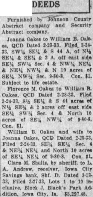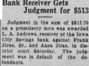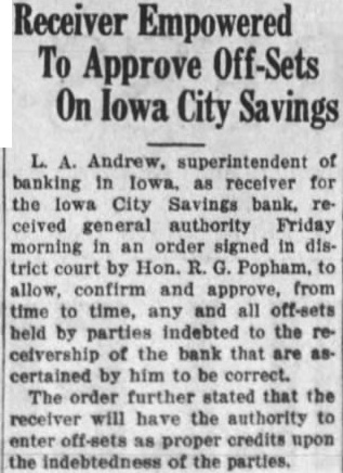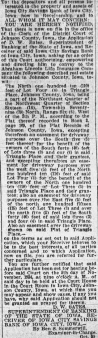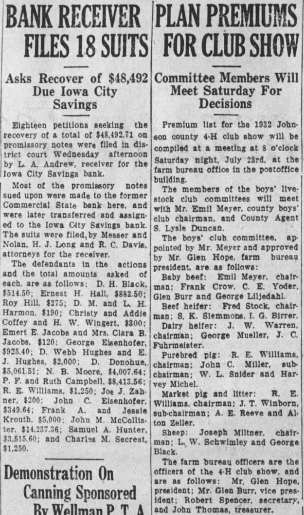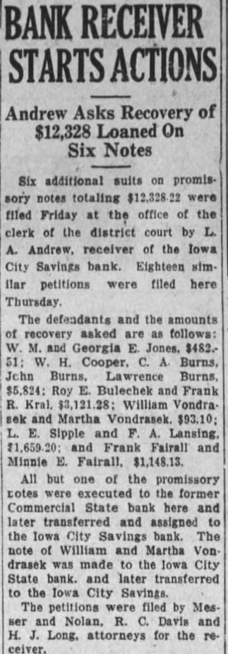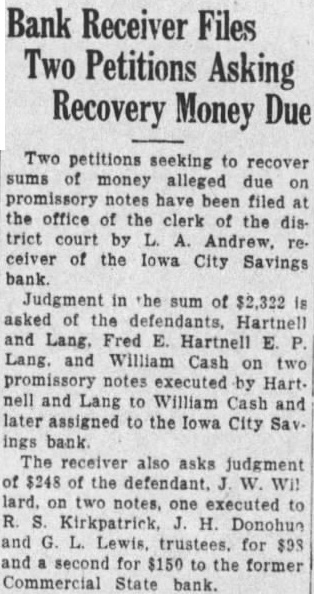 States bank, Dyersville, $5,000; Grinnell State bank, Grinnell, $16,039; State National bank, Iowa Falls (receiver), $22,000; Security Savings bank, McCallsburg, $2,600; Cedar Rapids Life Insurance company, Cedar Rapids, $850; Des Moines Joint Stock Land bank, Des Moines, $1,376; Regional Agricultural Credit corporation, Sioux City, $600.