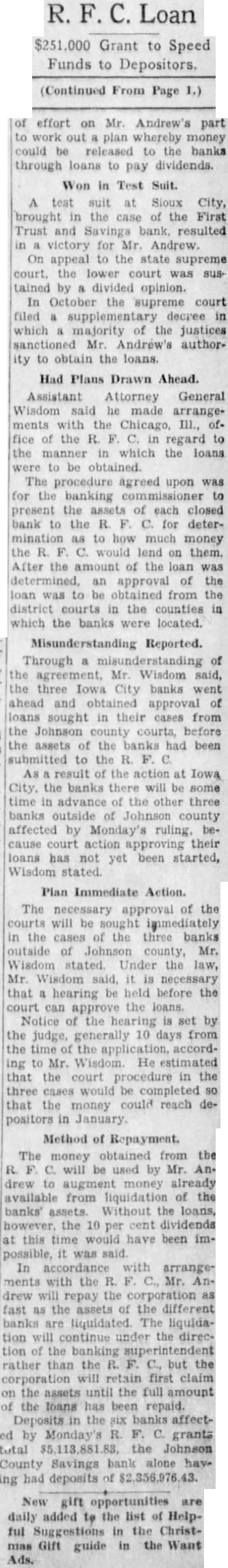 Loan $251,000 Grant to Speed Funds to Depositors. (Continued From Page 1.) of effort on Mr. Andrew's part to work out plan whereby money could be released to the banks through loans to pay dividends. Won in Test Suit. A test suit at Sioux City, brought in the case of the First Trust and Savings bank resulted victory for Mr. Andrew. On appeal to the state supreme court, the lower court was sustained by divided opinion. In October the supreme court filed supplementary decree in which majority of the justices sanctioned Mr. Andrew's authority to obtain the loans. Had Plans Drawn Ahead. Assistant Attorney General Wisdom said he made arrangements with the Chicago, Ill., office of the R. in regard to the manner in which the loans were to be obtained. The procedure agreed upon was for the banking to present the assets of each closed bank to the for deteras to how much money the R. would lend on them. After the amount of the loan was determined, an approval of the loan was to be obtained from the district courts in the counties in which the banks were located. Misunderstanding Reported. Through of the agreement, Mr. Wisdom said, the three Iowa City banks went ahead and obtained approval of loans sought in their cases from the Johnson courts, before the assets of the banks had been to the R. result of the action at Iowa City, the banks there will be some time in advance of the other three banks outside of Johnson county affected by Monday's ruling, because court action approving their loans has not yet been started, Wisdom stated Plan Immediate Action. The necessary approval of the courts will be sought immediately in the cases of the three banks outside of Johnson county, Mr. stated. Under the law, Mr. Wisdom said, that hearing be held before the court can approve the loans. Notice of the hearing is set by the judge, generally 10 days from the time the accordto Mr. Wisdom He estimated ing that the court procedure in the three cases would be completed that the money could reach depositors in January. Method of Repayment. The money obtained from the will be used by Mr. Andrew to augment money already available from liquidation of the banks' assets. Without the loans, however, the 10 per cent dividends at this time would have been impossible, was said In accordance with arrange ments with the R. Mr. Andrew will repay the corporation as fast as the assets of the different banks are liquidated The liquidation will continue under the direction of the banking superintendent rather than the C., but the corporation retain first claim on the assets until the full amount of the loans has been repaid. Deposits the six banks affected by Monday's R. grants total the Johnson County Savings bank alone hay. had deposits of $2,356,976.43. New gift opportunities are daily added to the list of Helpful Suggestions in the Christmas Gift guide in the Want Ads.