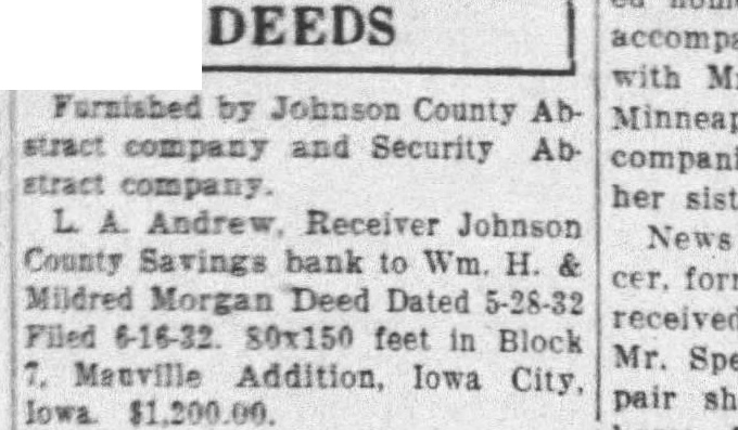 DEEDS Furnished by Johnson County Abstract company and Security Abstract company. L. A. Andrew, Receiver Johnson County Savings bank to Wm. H. & Mildred Deed Dated 5-28-32 Filed 6-16-32. 80x150 feet in Block 7, Mauville Addition, Iowa City,