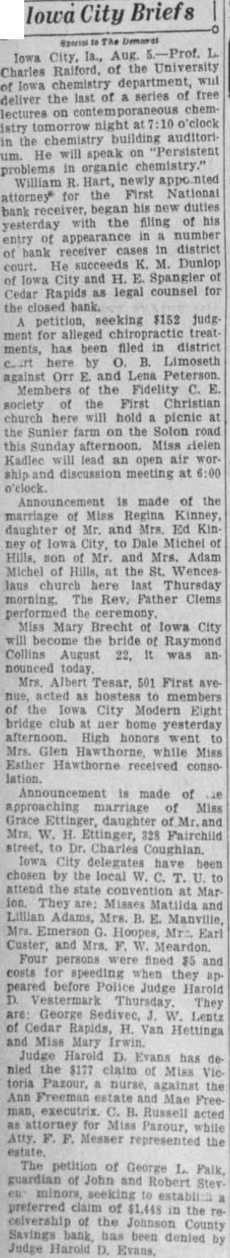 Iowa City, the University Charles Raiford, of department, will chemistry deliver the last series of free chemlectures tomorrow night the chemistry building "Persistent He will speak organic chemistry." William Hart, First National for the began his new duties bank the filing of his yesterday number entry appearance cases district bank receiver He Dunlop court. Iowa City and Spangler Rapids legal counsel for Cedar the closed bank. petition, seeking $152 ment for alleged chiropractic treatbeen filed in district ments, has here by Limoseth Orr and Peterson. Members the Fidelity society of the First Christian church hold picnic the Sunier farm on the Solon road Sunday Miss Helen lead an open air wor discussion meeting at o'clock. is made of the marriage Miss Regina Kinney, daughter Mr. and Mrs. Ed Iowa City, to Dale Michel of son Mr. and Mrs. Adam Michel Hills, at the St. church here Thursday morning. The Rev. Father Clems performed the ceremony. Miss Mary Brecht Iowa City become the bride of Collins August 22, an nounced today Mrs. Albert Tesar, 501 First acted hostess to the Iowa City Modern Eight bridge club home afternoon. High honors went Mrs. Glen Hawthorne, while Miss Esther consolation. Announcement made of approaching marriage of Miss Grace daughter Mrs. Ettinger, 328 Fairchild street, Charles Coughlan. Iowa delegates been chosen by local attend the state convention Mar They Misses Matilda and Lillian Adams, Mrs. Emerson Hoopes, Custer, and Meardon. Four fined $5 costs for they peared before Judge Harold Thursday. They George Lentz Cedar Rapids, Van Hettinga and Miss Mary Judge Harold Evans has nied the $177 claim Miss Pazour, against the Ann Freeman Mae Freeexecutrix. Russell Miss Pazour, while Messer represented the The petition of George Falk, guardian John and Robert minors, seeking preferred claim of in ceivership the Johnson County Savings bank has denied Harold