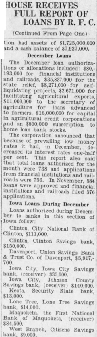 HOUSE RECEIVES FULL REPORT OF LOANS BY R. C. (Continued From Page One) tion had assets of $1,725,000,000 and a cash balance of $7,927,000. December Loans The December loan authorizations allocations included: $80,193,000 financial institutions and railroads, for the state relief, selfliquidating projects, for facilitating agricultural exports, $11,000,000 secretary agriculture for loans advanced farmers, for capital in agricultural credit corporations and an subscription to home loan bank stocks. The that prevailing low money rates had, in creased its rates one-half per cent. This report that total loans for the month were 738 and applications from financial railroads were 756. In November, 584 loans approved financial institutions and railroads filed 576 applications. Iowa Loans During December Loans authorized during December to banks in this section of Iowa follow: Clinton, City National Bank of Clinton, $111,000. Clinton, Clinton Savings bank, $150,000. Davenport, Union Savings Bank & Trust Co. of Davenport, $5,917,700. Iowa City, Iowa City Savings bank, (receiver) $35,000. Iowa City, Johnson County Savings bank, (receiver) $140,000 Keota, Security State bank, Lone Tree, Lone Tree Savings bank, $14,000. Maquoketa, the First National Bank of Maquoketa, (receiver) West Branch, Citizens Savings bank, $9,000.