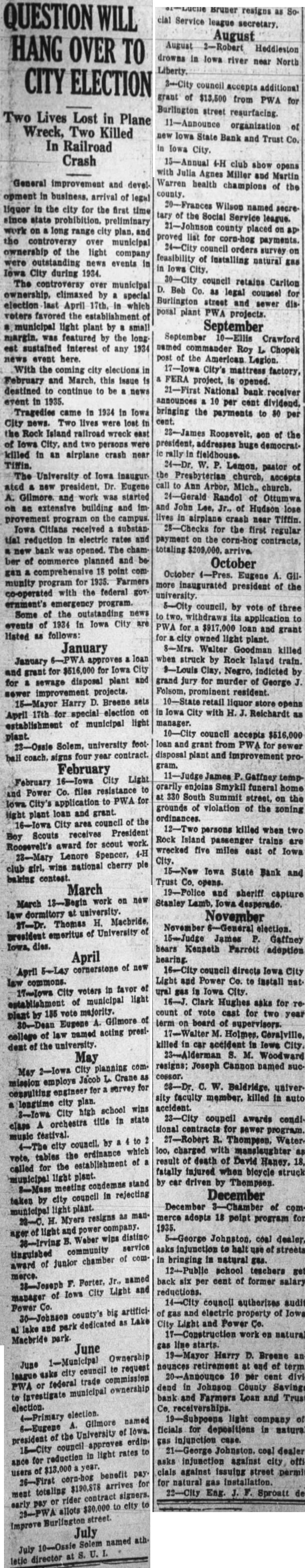Bruner resigns Service league secretary. August Heddleston drowns near North Liberty. council accepts additional grant $13,500 from PWA for Burlington street resurfacing. organization State Bank and Iowa City. 4-H club show opens Julia Agnes Miller and Martin Warren health champions of the county. Wilson named secreof the Social Service league. county placed proved list for corn-hog payments. council orders on feasibility of natural gas City. council retains Beb Co. legal counsel for Burlington street and sewer disposal plant PWA projects. September September Crawford named commander Roy Chopek of the American Legion. 17-Iowa City's mattress factory, FERA project, opened. National bank receiver announces per cent dividend, bringing the payments Roosevelt, son of the president, addresses huge democratfieldhouse. 24-Dr. pastor the Presbyterian church, accepts to Ann Arbor, Mich., church. 24-Gerald Randol of Ottumwa and John Lee, Jr., of Hudson lose in airplane crash near Tiffin. for the first regular payment on the contracts, totaling $209,000. October October Eugene more inaugurated president the university. 5-Oity council, by vote of three its application to for $917,000 loan and grant owned light plant. 8-Mrs. Walter Goodman killed struck Rock Island train. Clay, Negro, indicted grand jury for murder of George Folsom. resident. liquor opens Iowa City with Reichardt manager. 10-City council accepts loan and grant from PWA for sewer disposal plant and proorarily funeral home South Summit street, on the grounds of violation of the zoning ordinances. persons killed when two Rock Island passenger trains are wrecked five miles east of Iowa City. Iowa State Bank and Trust Co. opens. 19-Police sheriff capture Stanley November November election. 15-Judge James Gaffney hears Kenneth adeption hearing. council directs Iowa City Light and Power Co. to install Iowa City. Clark Hughes asks for count vote cast for two year term board supervisors. in car accident resigns; Joseph Cannon named successor. C. Baldridge, university faculty member, killed auto accident. council awards conditional contracts for sewer program. 27-Robert R. Thompson, Water. charged with manalaughter result of death of David Haney. fatally injured when bicycle struck driven by Thempson. December December commerce adopts 18 point program for 1935. 5-George Johnston, coal dealer, injunction to streets bringing natural gas. 12-Public school teachers get back six per cent of former salary reductions. council authorizes audit and electric property Iowa City Light Power 17-Construction natural line starts. Harry D. Breene announces end of term. 20-Announce 10 per cent divi. dend Johnson County Savings Farmers Loan and Trust receiverships. 19-Subpoens light company ficials for depositions gas injunction case. coal dealer. asks injunction against city, offiagainst issuing street permit for natural gas Eng. Sproatt