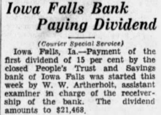 (Courier Special Service) Iowa Falls, first dividend of 15 cent by closed People's Trust and Savings Falls was started W. assistant examiner charge receivership the bank The dividend amounts