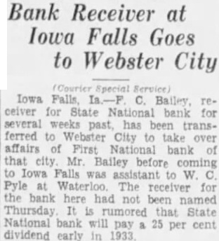 Des Moines, Home Savings bank, $1,000. Farmers Trust and Savings Eldora, Citizens Savings bank $8,000. Exira, Exchange State bank, Gray, Farmers Savings bank Hampton, Franklin State bank, $20,000. Hartwick. The State bank. $11,000. Independence, Commercial State bank (receiver), $40,000. Indianola, The First National bank of Indiacola (receiver), $75.Iowa City, Iowa City Savings bank (receiver), $35,000. Iowa City, Johnson County Sav. ings bank (receiver), $140,000. Iowa Falls, The State National bank of Iowa Falls (receiver). $35,500. Joice, Farmers Trust and Savings bank, $13,000. Keota, Security State $13,000. The First National bank of LeMars, Lohrville Savings bank, $14,000. Lone Tree, Lone Tree Savings bank, Maquoketa, The First National bank of Maquoketa (receiver), Meservey, Farmers Savings bank (receiver), $9,500. Mitchell, Mitchell Savings bank Farmers Trust and Savings bank, $2,500. Oskalooss, The Oskaloosa Na. tional bank (receiver, $142,000. Randolph, Randolph State bank $3,814. Reinbeck, First Savings bank of Reinbeck, $7,000. Sac City, Citizens Savings bank $41,000. Sheffield, The First National