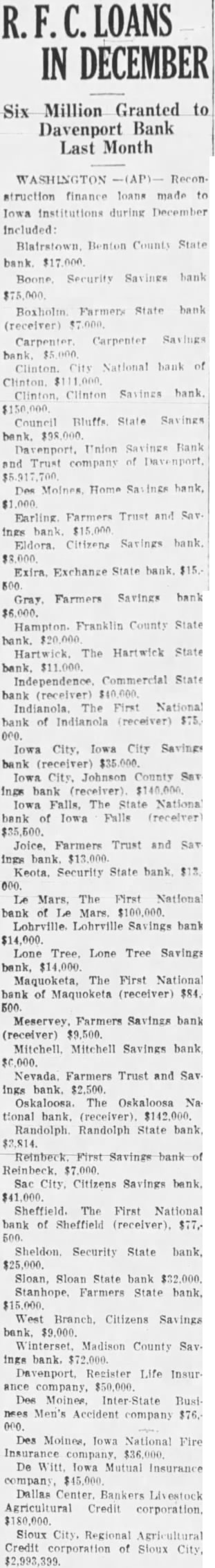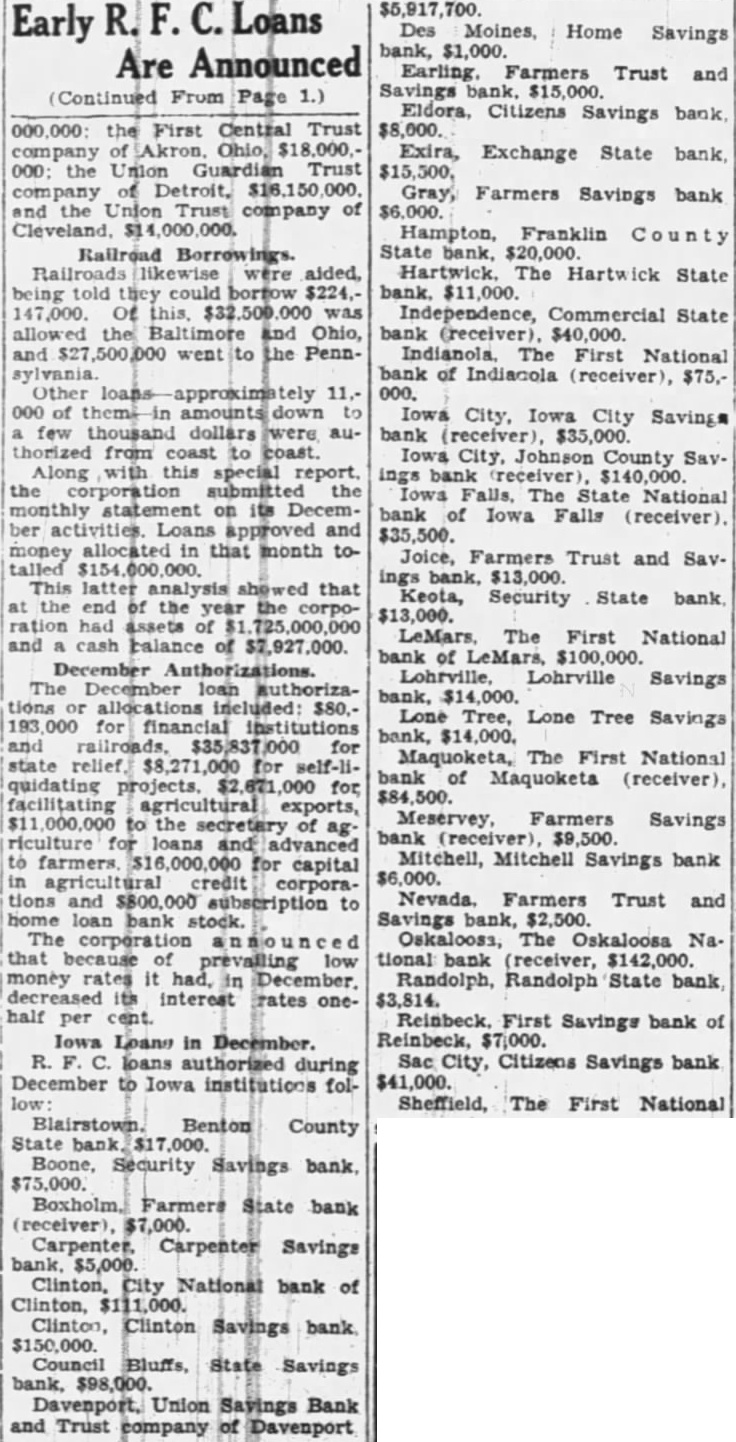 Railroad Borrowings. Railroads likewise were being told they could borrow $224,147,000. Of this, was allowed the Baltimore and Ohio, and went to the PennOther 000 of amounts down few thousand dollars authorized from coast to coast. Along with this special report, the corporation submitted the monthly statement on its December activities. Loans approved and money allocated in that month totalled This latter analysis that the end the year the corporation assets and cash balance of $7,927,000. December Authorizations. The December loan authorizations or allocations included: $80,for financial institutions and $35,837,000 for state relief. for self-liquidating projects, for facilitating agricultural exports, to the secretary of ag. riculture for loans and advanced to farmers for capital in agricultural credit corporations and subscription to home loan bank stock. The corporation that prevailing low money rates it had, in December. decreased its interest rates onehalf per cent. Iowa Loans in December. R. loans authorized during December to Iowa institutions folBenton County State $17,000. Boone, Security Savings $75,000. Boxholm. Farmers State bank (receiver), $7,000. Carpenter, Carpenter Savings Clinton, City National bank of Clinton, $111,000. Clinton, Clinton Savings bank $150,000. Council Bluffs, State Savings bank, $98,000. Davenport, Union Savings Bank and Trust company Davenport