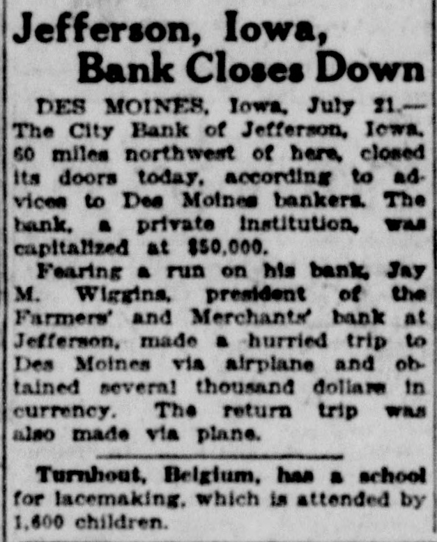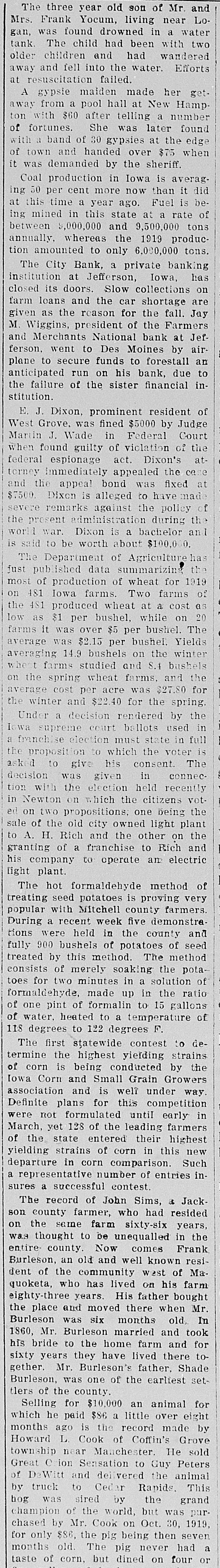 INTERMOUNTAIN. Mrs. Imanuel J. Kandt was killed and her husband and Mr. and Mrs. Andrew Stitber were injured in a cyclone that swept through a portion of McHenry county, ten miles south of Anamoose, N. D., late Friday. Mose Gibson, negro, sentenced to hang for murder of Roy Trapp, Fullerton, Cal., rancher, has confessed to ten murders and SO mapy burglaries the could not enumerate them. Only families with children can rent Mwellings owned by H. L. Neslin, a Walla Walla landlord, it has been anmounced. Mr. Neslin has promised to give his tenants a month's rept free for every child born to them while they are residing in his houses. Excerpts for the Marconi Wireless company, who are at St. John, N. F., conducting experiments in long distance wireless telephonic communitations, have announced that they have heard messages from the Chelmsford station near London more than 2,000 miles distant. All records for travel in Yellowstone national park were broken on July 22, when 1383 persons and 241 private automobiles were admitted. More than 26,000 persons have visited the park this season, about 20 per cent more than during the same period last year. DOMESTIC. Walter S. Wilson, widely known throughout the southwest as a. cowboy and exhibition roper, was shof and killed Saturday on a country road near Winfield, Kansas. Ashby H: Keeney, son of Seth A. Keeney, Santa Barbara, Cal., bank president and former owner of the Brooklyn Daily Eagle, was killed Saturday in an auto accident. J. M. Zion was nominated for governor by the Farmer-Labor party at Indianapolis, Ind., Saturday, over Francis J. Dillon of Indianapolis. Mr. Dillon was the party's choice for United States senator. Mr. Zion is a farmer. All forms of work were stopped Saturday at Vera Cruz as a result of the general strike. At a meeting of merchants it was proposed to close all business places if the strike continued. Bodies of 881 American soldiers who died overseas, arrived at New York, July 21, on the steamsnip Princess Matolka from Danzig and Antwerp. Twenty-five "war brides" of French and German nativity were among the first cabin passengers and Polish repatriated troops composed the majority of the 2,094 steerage passengers. Prohibition has been beneficial to the nation's industrial and economic life, in the opinion of Elbert H. Gary, head of the United States Steel corporation, who issued a statement at New York on the eve of departure for Europe, giving his views on the business outlook generally. Dr. Stockton Axson, President Wilson's brother-in-law, and during the war national secretary of the American Red Cross, collapsed last week, and left Los Angeles to seek tréatment for nervous breakdown. Two miners were wounded when the Portsmouth Solvay Coal company's mine at Freeborn, W. Va., was attacked by Spersons hidden in the hills on the West Virginia and Kentucky sides of Tug river. Chairman White of the Democratic national committee has announced that Saturday, August 7, had been chosen as the date for notification of Goyernor Cox_of his nomination as presidential candidate. The City Bank of Jefferson, Ia., has closed its door. Fearing a run on his bank, Jam M. Wiggins, president of the Farmers and Merchants' bank at Jefferson, made a hurried trip to Des Moines via airplane and secured several thousand dollars in currency. Whether the spectre of a nationwide railway strike has been laid by the $600,000,000 wage increase granted on July 20 to more than 1,800,000 railroad employees remains undecided. The $600,000,000 award represents a 21 per cent increase in the pay of the railwaymen. For the first time in history the roads' payrolls this year will pass the three billion dollar mark. Parley P. Christensen, FarmerLabor party candidate for president, telegraphed from Denver to Senator Harding, Republican nominee, and Governor Cox, Democratic candidate, suggesting that all join in a demand upon President Wilson to immediately release Eugene V. Debs from prison. Jack Johnson, negro, former heavyweight champion pugilist, crossed the international boundary line from Mexico near San Diego on Tuesday, and was arrested by the deputy United States marshal. Johnson is under sentence in Chicago for violation of the Mann act. On July 20, Sir Thomas Lipton's yacht, the Shamrock IV, ran up a tally of two races to none against the American defender Resolute winning in