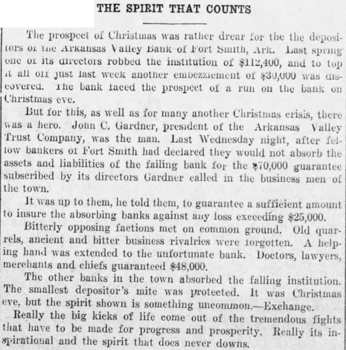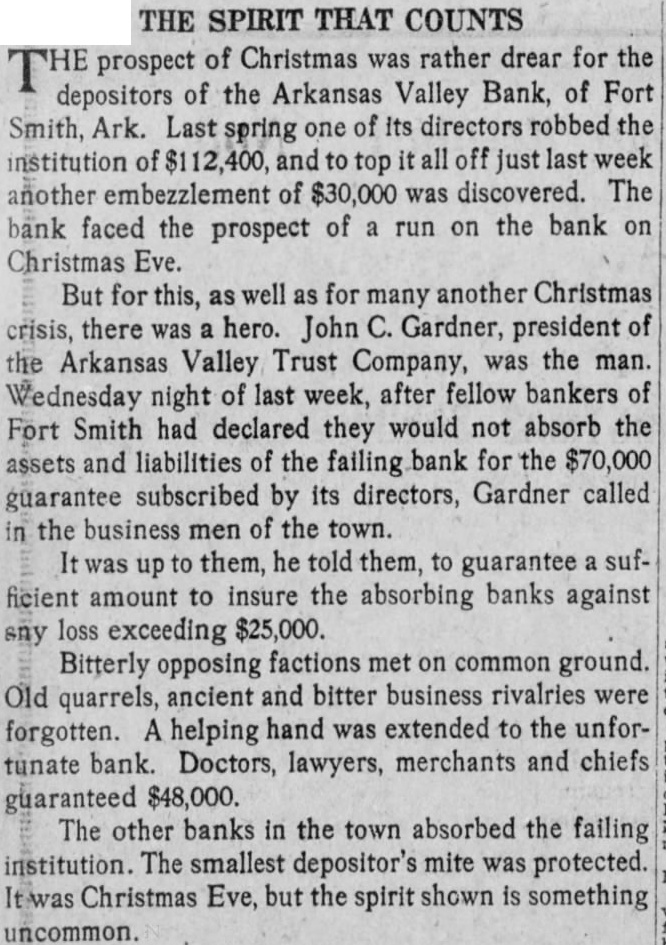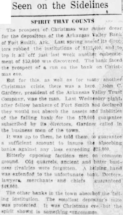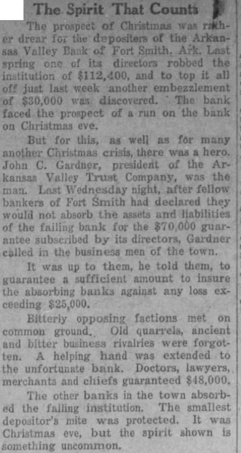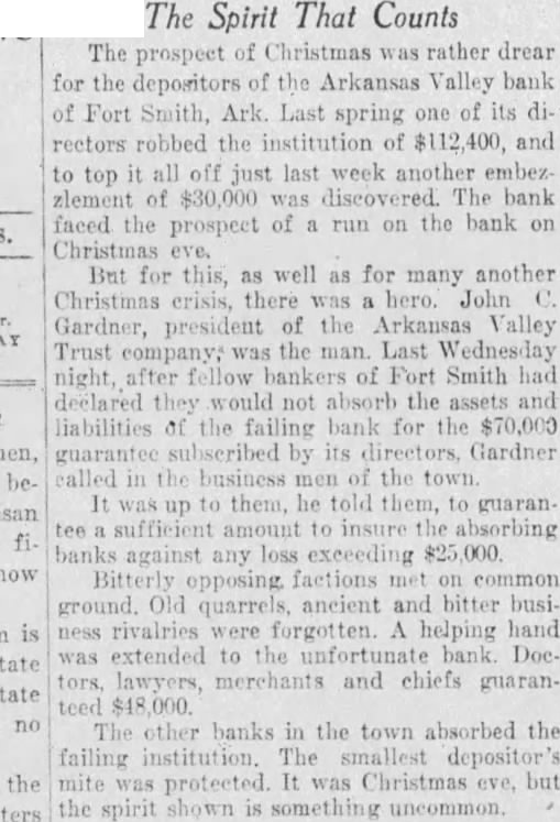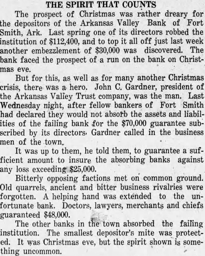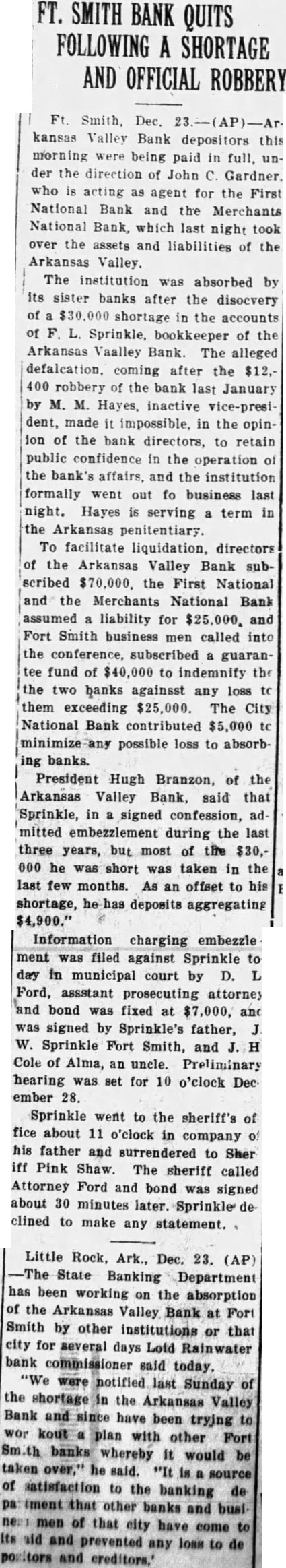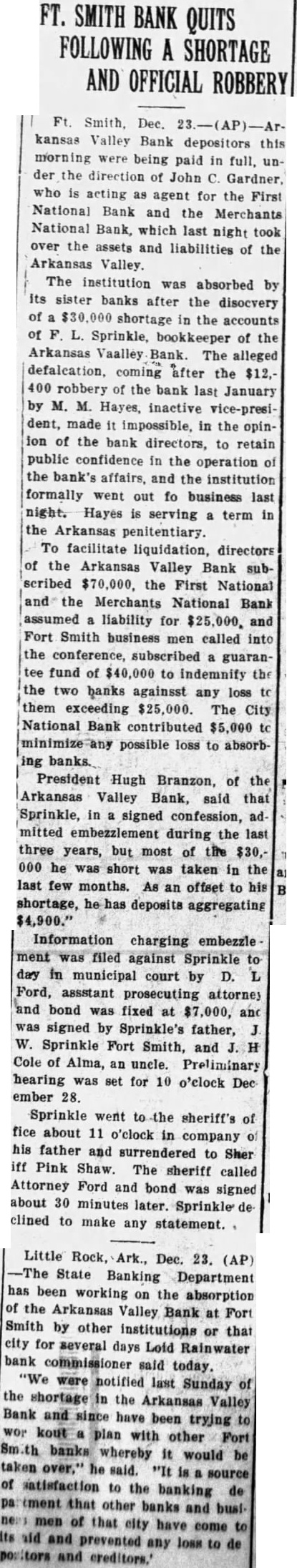 FT. SMITH BANK QUITS FOLLOWING A SHORTAGE AND OFFICIAL ROBBERY Ft. Smith, Dec. kansas Valley Bank depositors this morning were being paid in full, under the direction of John C. Gardner, who is acting as agent for the First National Bank and the Merchants National Bank, which last night took over the assets and liabilities of the Arkansas Valley. The institution was absorbed by its sister banks after the disocvery of a $30,000 shortage in the accounts of F. L. Sprinkle, bookkeeper of the Arkansas Vaalley Bank. The alleged defalcation. coming after the $12,400 robbery of the bank last January by M. M. Hayes, inactive vice-president, made it impossible, in the opinion of the bank directors, to retain public confidence in the operation of the bank's affairs, and the institution formally went out fo business last night. Hayes is serving a term in the Arkansas penitentiary. To facilitate liquidation, directors of the Arkansas Valley Bank subscribed $70,000. the First National and the Merchants National Bank assumed a liability for $25,000. and Fort Smith business men called into the conference, subscribed a guarantee fund of $40,000 to indemnify the the two banks againsst any loss to them exceeding $25,000. The City National Bank contributed $5,000 tc minimize-any possible loss to absorbing banks. President Hugh Branzon, of the Arkansas Valley Bank, said that Sprinkle, in a signed confession, admitted embezzlement during the last three years, but most of the $30,000 he was short was taken in the last few months. As an offset to his shortage, he has deposits aggregating $4,900." Information charging embezzle ment was filed against Sprinkle to day in municipal court by D. L Ford, assstant prosecuting attorney and bond was fixed at $7,000, and was signed by Sprinkle's father, J W. Sprinkle Fort Smith, and J.H Cole of Alma, an uncle. Preliminary hearing was set for 10 o'clock Dec ember 28. Sprinkle went to the sheriff's of fice about 11 o'clock in company of his father and surrendered to Sher iff Pink Shaw. The sheriff called Attorney Ford and bond was signed about 30 minutes later. Sprinkle de clined to make any statement. Little Rock, Ark., Dec. 23. (AP) -The State Banking Department has been working on the absorption of the Arkansas Valley Bank at Fort Smith by other institutions or that city for several days Loid Rainwater bank commissioner said today. "We were notified last Sunday of the shortage in the Arkansas Valley Bank and since have been trying to wor kout a plan with other Fort Sm banks whereby it would be taken over," he said. "It is a source of satisfaction to the banking de pa (ment that other banks and businews men of that city have come to its aid and prevented any loss to de positors and creditors.'