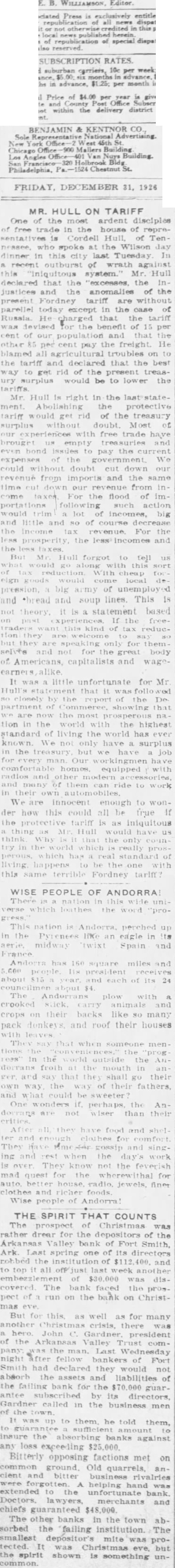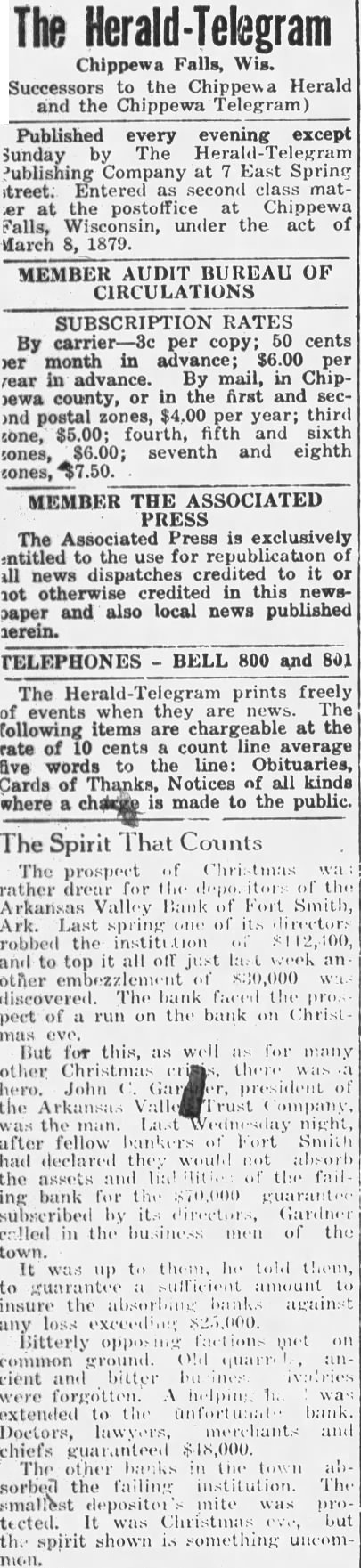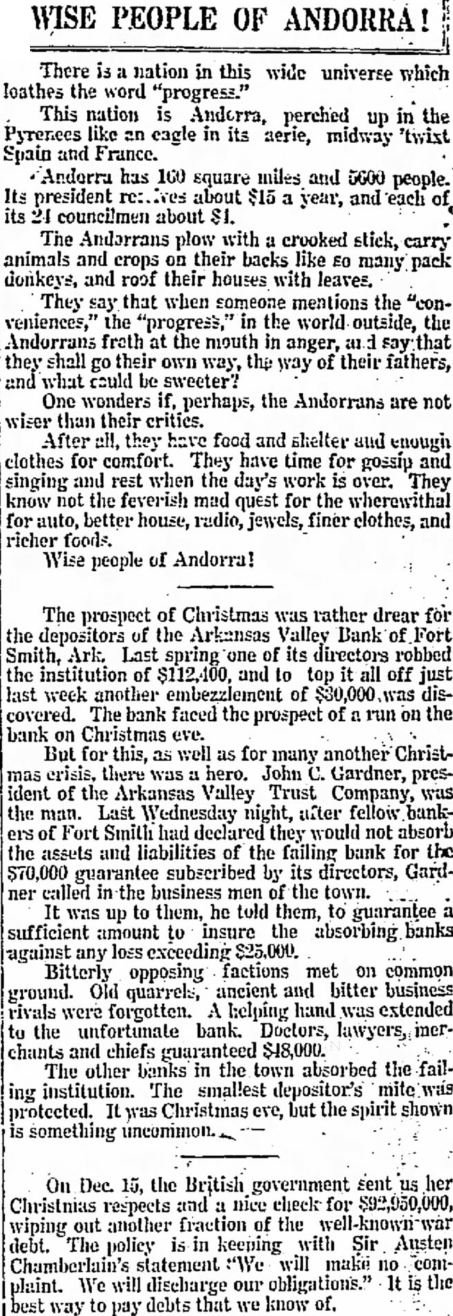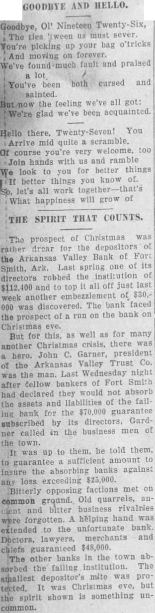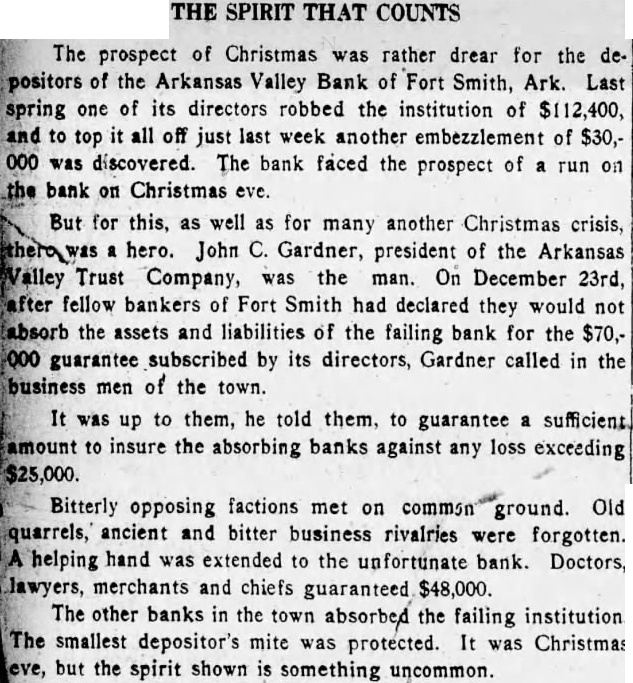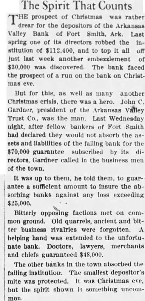 FT. SMITH BANK QUITS FOLLOWING A SHORTAGE AND OFFICIAL ROBBERY Ft. Smith, Dec. kansas Valley Bank depositors this morning were being paid in full, under the direction of John C. Gardner, who is acting as agent for the First National Bank and the Merchants National Bank, which last night took over the assets and liabilities of the Arkansas Valley. The institution was absorbed by its sister banks after the disocvery of a $30,000 shortage in the accounts of F. L. Sprinkle, bookkeeper of the Arkansas Vaalley Bank. The alleged defalcation. coming after the $12,400 robbery of the bank last January by M. M. Hayes, inactive vice-president, made it impossible, in the opinion of the bank directors, to retain public confidence in the operation of the bank's affairs, and the institution formally went out fo business last night. Hayes is serving a term in the Arkansas penitentiary. To facilitate liquidation, directors of the Arkansas Valley Bank subscribed $70,000. the First National and the Merchants National Bank assumed a liability for $25,000. and Fort Smith business men called into the conference, subscribed a guarantee fund of $40,000 to indemnify the the two banks againsst any loss to them exceeding $25,000. The City National Bank contributed $5,000 tc minimize-any possible loss to absorbing banks. President Hugh Branzon, of the Arkansas Valley Bank, said that Sprinkle, in a signed confession, admitted embezzlement during the last three years, but most of the $30,000 he was short was taken in the last few months. As an offset to his shortage, he has deposits aggregating $4,900." Information charging embezzle ment was filed against Sprinkle to day in municipal court by D. L Ford, assstant prosecuting attorney and bond was fixed at $7,000, and was signed by Sprinkle's father, J W. Sprinkle Fort Smith, and J.H Cole of Alma, an uncle. Preliminary hearing was set for 10 o'clock Dec ember 28. Sprinkle went to the sheriff's of fice about 11 o'clock in company of his father and surrendered to Sher iff Pink Shaw. The sheriff called Attorney Ford and bond was signed about 30 minutes later. Sprinkle de clined to make any statement. Little Rock, Ark., Dec. 23. (AP) -The State Banking Department has been working on the absorption of the Arkansas Valley Bank at Fort Smith by other institutions or that city for several days Loid Rainwater bank commissioner said today. "We were notified last Sunday of the shortage in the Arkansas Valley Bank and since have been trying to wor kout a plan with other Fort Sm banks whereby it would be taken over," he said. "It is a source of satisfaction to the banking de pa (ment that other banks and businews men of that city have come to its aid and prevented any loss to de positors and creditors.'