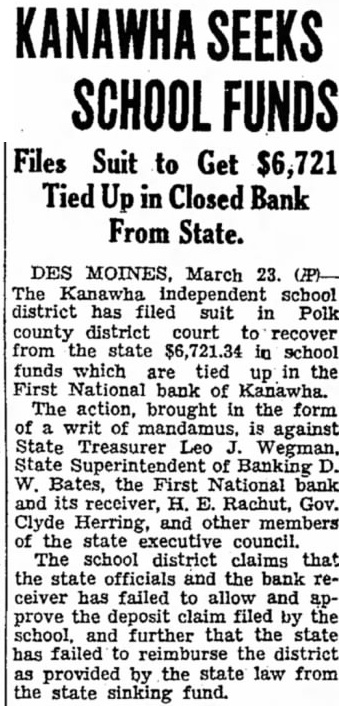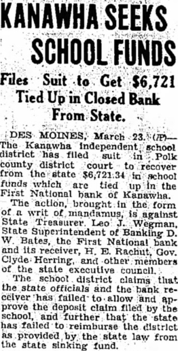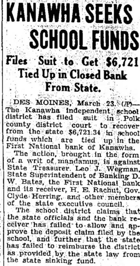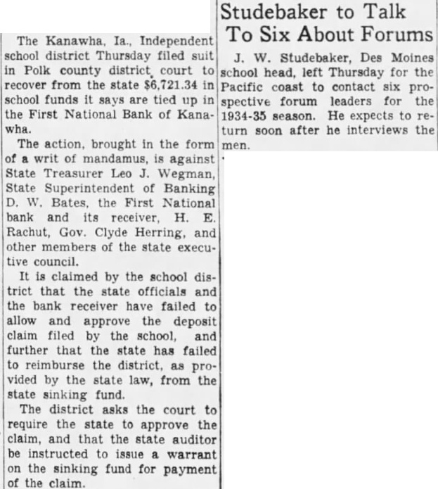 Studebaker to Talk To Six About Forums The Kanawha, Ia., Independent school district Thursday filed suit J. W. Studebaker, Des Moines in Polk county district court to school head, left Thursday for the recover from the state 721 34 in Pacific coast to contact six proschool funds it says are tied up in spective forum leaders for the the First National Bank of Kana- 1934-35 season. He expects to rewha. turn soon after he interviews the The action. brought in the form men. of writ of mandamus, is against State Treasurer Leo J. Wegman, State Superintendent of Banking D. W. Bates, the First National bank and its receiver, H. E Rachut, Gov. Clyde Herring, and other members of the state executive council. It is claimed by the school district that the state officials and the bank receiver have failed to allow and approve the deposit claim filed by the school, and further that the state has failed to reimburse the district, as provided by the state law, from the state sinking fund. The district asks the court to require the state to approve the claim, and that the state auditor be instructed to issue a warrant on the sinking fund for payment of the claim.