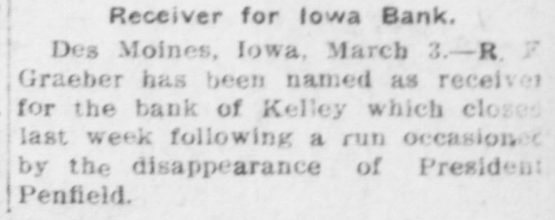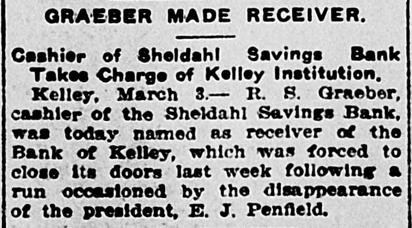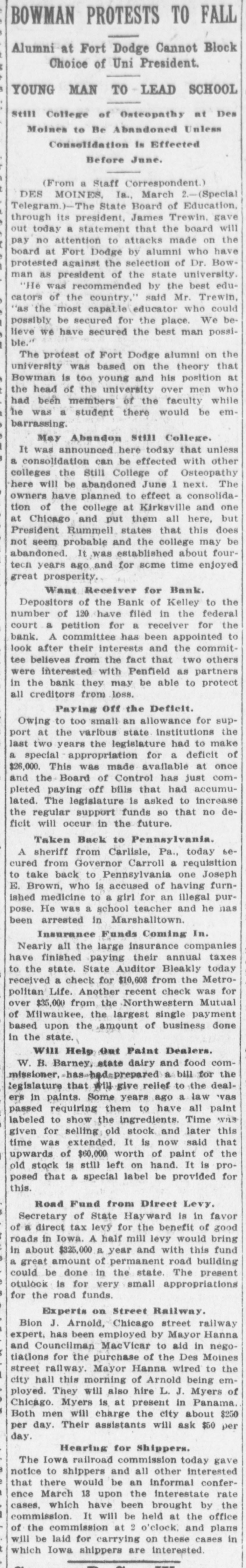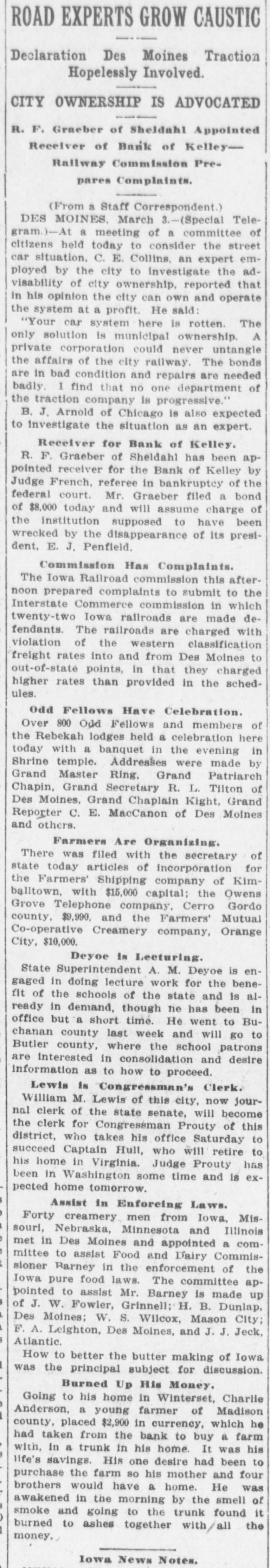 ROAD EXPERTS GROW CAUSTIC Declaration Des Moines Traction Hopelessly Involved. CITY OWNERSHIP IS ADVOCATED R. F. Graeber of Sheldahl Appointed Receiver of Bank of KelleyRailway Commission Prepares Complaints. (From a Staff Correspondent.) DES MOINES. March 3.-(Special Telegram.)-At a meeting of a committee of citizens held today to consider the street car situation, C. E. Collins. an expert employed by the city to investigate the advisability of city ownership, reported that in his opinion the city can own and operate the system at a profit. He said: "Your car system here is rotten. The only solution is municipal ownership. A private corporation could never untangle the affairs of the city railway. The bonds are in bad condition and repairs are needed badly. I find that no one department of the traction company is progressive." B. J. Arnold of Chicago is also expected to investigate the situation as an expert. Receiver for Bank of Kelley. R. F. Graeber of Sheldahl has been appointed receiver for the Bank of Kelley by Judge French, referee in bankruptcy of the federal court. Mr. Graeber filed a bond of $8,000 today and will assume charge of the institution supposed to have been wrecked by the disappearance of its president, E. J. Penfield. Commission Has Complaints. The Iowa Railroad commission this afternoon prepared complaints to submit to the Interstate Commerce commission in which twenty-two Iowa railroads are made defendants. The railroads are charged with violation of the western classification freight rates into and from Des Moines to out-of-state points, in that they charged higher rates than provided in the schedules. Odd Fellows Have Celebration. Over 800 Odd Fellows and members of the Rebekah lodges held a celebration here today with a banquet in the evening in Shrine temple. Addresses were made by Grand Master Ring, Grand Patriarch Chapin, Grand Secretary R. L. Tilton of Des Moines, Grand Chaplain Kight, Grand Reporter C. E. MacCanon of Des Moines and others. Farmers Are Organizing. There was filed with the secretary of state today articles of incorporation for the Farmers' Shipping company of Kimballtown, with $15,000 capital; the Owens Grove Telephone company, Cerro Gordo county, $9,990, and the Farmers' Mutual Co-operative Creamery company, Orange City, $10,000. Deyoe is Lecturing. State Superintendent A. M. Deyoe is engaged in doing lecture work for the benefit of the schools of the state and is already in demand, though he has been in office but a short time. He went to Buchanan county last week and will go to Butler county, where the school patrons are interested in consolidation and desire information as to how to proceed. Lewis is Congressman's Clerk. William M. Lewis of this city, now journal clerk of the state senate, will become the clerk for Congressman Prouty of this district, who takes his office Saturday to succeed Captain Hull, who will retire to his home in Virginia. Judge Prouty has been in Washington some time and is expected home tomorrow. Assist in Enforcing Laws. Forty creamery men from Iowa, Missourl, Nebraska, Minnesota and Illinois met in Des Moines and appointed a committee to assist Food and Dairy Commissioner Barney in the enforcement of the Iowa pure food laws. The committee appointed to assist Mr. Barney is made up of J. W. Fowler, Grinnell; H. B. Dunlap, Des Moines; W. S. Wilcox, Mason City; F. A. Leighton, Des Moines, and J. J. Jeck, Atlantic. How to better the butter making of Iowa was the principal subject for discussion. Burned Up His Money. Going to his home in Winterset, Charlie Anderson, a young farmer of Madison county, placed $2,900 in currency, which he had taken from the bank to buy a farm with, in a trunk in his home. It was his life's savings. His one desire had been to purchase the farm so his mother and four brothers would have a home. He was awakened in the morning by the smell of smoke and going to the trunk found it burned to ashes together with/all the money, Iowa News Notes.