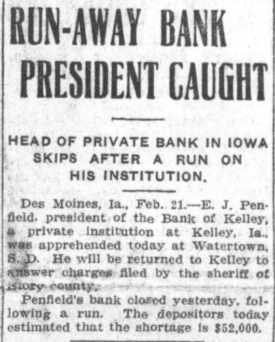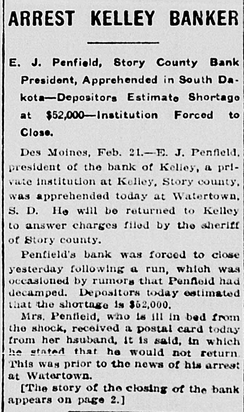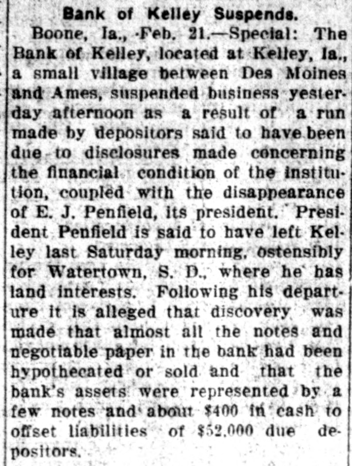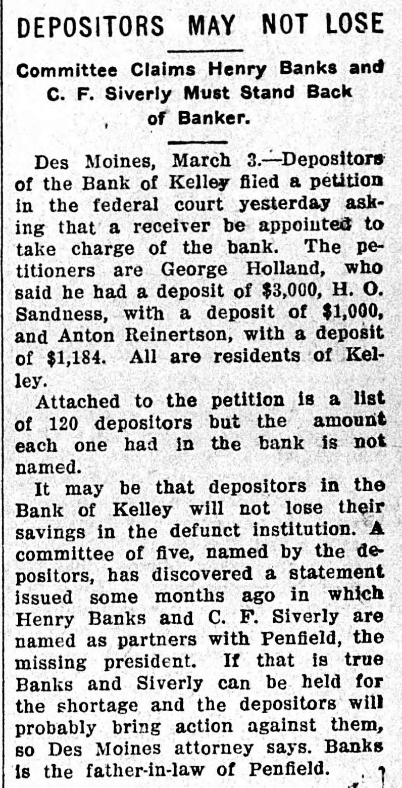 ROAD EXPERTS GROW CAUSTIC Declaration Des Moines Traction Hopelessly Involved. CITY OWNERSHIP IS ADVOCATED R. F. Graeber of Sheldahl Appointed Receiver of Bank of KelleyRailway Commission Prepares Complaints. (From a Staff Correspondent.) DES MOINES. March 3.-(Special Telegram.)-At a meeting of a committee of citizens held today to consider the street car situation, C. E. Collins. an expert employed by the city to investigate the advisability of city ownership, reported that in his opinion the city can own and operate the system at a profit. He said: "Your car system here is rotten. The only solution is municipal ownership. A private corporation could never untangle the affairs of the city railway. The bonds are in bad condition and repairs are needed badly. I find that no one department of the traction company is progressive." B. J. Arnold of Chicago is also expected to investigate the situation as an expert. Receiver for Bank of Kelley. R. F. Graeber of Sheldahl has been appointed receiver for the Bank of Kelley by Judge French, referee in bankruptcy of the federal court. Mr. Graeber filed a bond of $8,000 today and will assume charge of the institution supposed to have been wrecked by the disappearance of its president, E. J. Penfield. Commission Has Complaints. The Iowa Railroad commission this afternoon prepared complaints to submit to the Interstate Commerce commission in which twenty-two Iowa railroads are made defendants. The railroads are charged with violation of the western classification freight rates into and from Des Moines to out-of-state points, in that they charged higher rates than provided in the schedules. Odd Fellows Have Celebration. Over 800 Odd Fellows and members of the Rebekah lodges held a celebration here today with a banquet in the evening in Shrine temple. Addresses were made by Grand Master Ring, Grand Patriarch Chapin, Grand Secretary R. L. Tilton of Des Moines, Grand Chaplain Kight, Grand Reporter C. E. MacCanon of Des Moines and others. Farmers Are Organizing. There was filed with the secretary of state today articles of incorporation for the Farmers' Shipping company of Kimballtown, with $15,000 capital; the Owens Grove Telephone company, Cerro Gordo county, $9,990, and the Farmers' Mutual Co-operative Creamery company, Orange City, $10,000. Deyoe is Lecturing. State Superintendent A. M. Deyoe is engaged in doing lecture work for the benefit of the schools of the state and is already in demand, though he has been in office but a short time. He went to Buchanan county last week and will go to Butler county, where the school patrons are interested in consolidation and desire information as to how to proceed. Lewis is Congressman's Clerk. William M. Lewis of this city, now journal clerk of the state senate, will become the clerk for Congressman Prouty of this district, who takes his office Saturday to succeed Captain Hull, who will retire to his home in Virginia. Judge Prouty has been in Washington some time and is expected home tomorrow. Assist in Enforcing Laws. Forty creamery men from Iowa, Missourl, Nebraska, Minnesota and Illinois met in Des Moines and appointed a committee to assist Food and Dairy Commissioner Barney in the enforcement of the Iowa pure food laws. The committee appointed to assist Mr. Barney is made up of J. W. Fowler, Grinnell; H. B. Dunlap, Des Moines; W. S. Wilcox, Mason City; F. A. Leighton, Des Moines, and J. J. Jeck, Atlantic. How to better the butter making of Iowa was the principal subject for discussion. Burned Up His Money. Going to his home in Winterset, Charlie Anderson, a young farmer of Madison county, placed $2,900 in currency, which he had taken from the bank to buy a farm with, in a trunk in his home. It was his life's savings. His one desire had been to purchase the farm so his mother and four brothers would have a home. He was awakened in the morning by the smell of smoke and going to the trunk found it burned to ashes together with/all the money, Iowa News Notes.