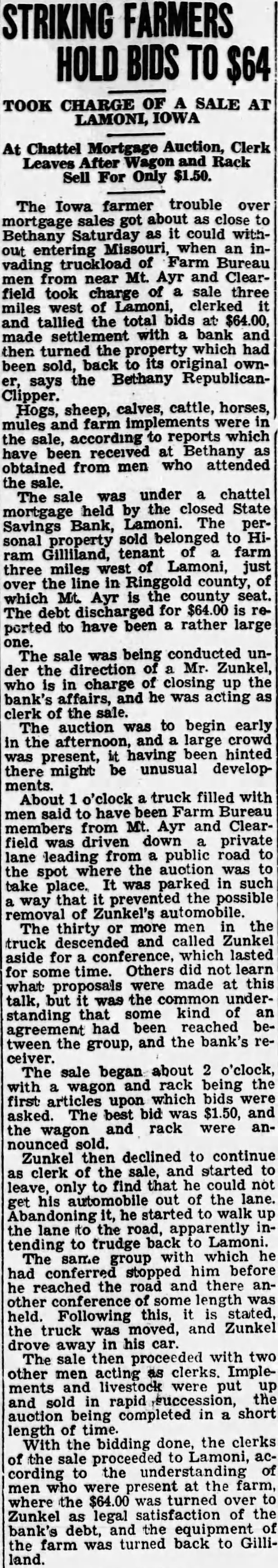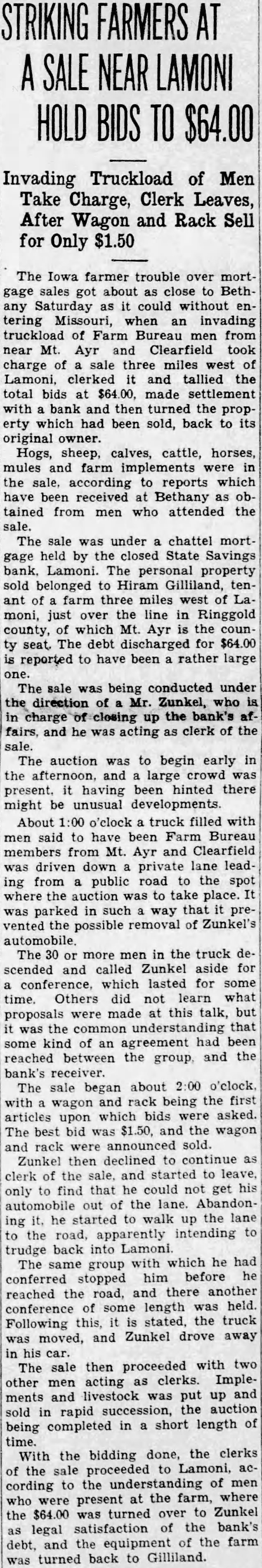 The Iowa farmer trouble over mortabout close to sales got as gage it could without Bethany Saturday as when invading Missouri, an entering Bureau men from truckload of Farm Clearfield took Mt. Ayr and near charge of sale three miles west of tallied the clerked it and Lamoni, made settlement total bids at $64.00, with bank and then turned the propback to its had been sold, which erty original owner. cattle, horses, sheep, calves, Hogs, were in and farm implements mules the sale, according to reports which Bethany as obbeen received at have attended the men who tained from sale. The sale was under chattel mortState Savings the closed held by gage The personal propbank, Lamoni. Gilliland, sold belonged erty west of three miles tenant of farm line in Ringthe Lamoni, just over is the which Mt. Ayr county, of gold discharged for The debt county seat. been rather to have $64 is reported large one. conducted unsale was being The Zunkel, who of Mr. the direction der the bank's of closing up in charge clerk of acting as and he was affairs, the sale. in to begin The auction was crowd was and large the afternoon, hinted there having been present, might be unusual developments. filled with o'clock truck About Farm Bureau have been men said to and Clearfield from Mt. Ayr members lane leaddown private was driven the spot road to from public ing where the auction was to take place that in such way It was parked removel of the possible prevented automobile. Zunkel's the truck men in The 30 or more Zunkel aside and called descended lasted for which conference, for did not learn time. Others some at this made were what proposals underthe common talk. but was kind of an agreethat some standing between the been reached ment had group, and the bank's receiver. o'clock. began about The sale the rack being and with wagon bids were which first articles upon and best bid was asked. The announced and rack the wagon sold. continue declined to Zunkel then started to and of the clerk he could not find that only to leave. the lane automobile out get to walk up he started Abandoning road. apparently lane to the the to Lamoni. back to trudge tending which he had with same group The before he him stopped conferred another and there the road, reached length conference the truck is stated. this. Following drove away and Zunkel car. with two then proceeded The Impleas clerks. acting other and put up and livestock ments auction the rapid succession, sold length of short completed in being time. the the bidding With proceeded to of the sale of the cording farm. where the present to Zunkel turned the bank's of the satisfaction legal of the farm and the equipment debt. turned back