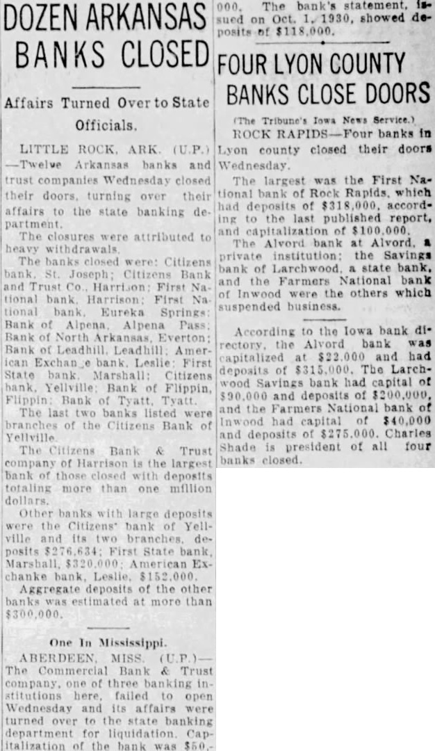 DOZEN ARKANSAS BANKS CLOSED FOUR LYON COUNTY BANKS CLOSE DOORS Affairs Turned Over to State Officials. LITTLE ROCK. ARK (U.P.) Twelve Arkansas banks and trust Wednesday closed their doors. turning over their affairs to the state banking de partment The closures were attributed to heavy withdrawals The banks were: Citizens Joseph Citizens Bank and Trust Co Harrison First Na tional First Na tional Eureka Springs Bank of Pass Bank of Everton Bank of Leadhill Leadhill Amer ican Exchan bank Leslie First State bank Citizens bank. Yellville Bank of Flippin, Flippin Bank of The last two banks listed were branches of the Citizens Bank of Yellville The Citizens Bank & Trust company of Harrison is the largest bank those closed with deposits totaling more than one million dollars. banks with large deposits were the Citizens* bank of Yellville and its deposits First State bank Marshall $320.000 American ExAggregate deposits of the other banks estimated at more than One In Mississippi ABERDEEN MISS The Commercial Bank Trust company. one three banking in stitutions here failed to open Wednesday and its affairs were turned over to the state banking department for liquidation Capitalization of the bank was $60. (The Tribune's Iowa News Service.) ROCK banks in Lyon county closed their doors Wednesday The largest was the First National bank of Rock Rapids. which had deposits of $318,000. according to the last published report, and of 000 The Alvord at Alvord. private institution: the Savings bank of Larchwood state bank, and the Farmers National bank of Inwood were the others which suspended business. According to the Iowa bank directory Alvord bank capitalized $22 000 and had deposits of $315,000. The Larchwood Savings bank had capital of $90 000 and deposits of $200,000, and the Farmers National bank Inwood had capital of $40,000 and deposits of Charles Shade is president of all four banks
