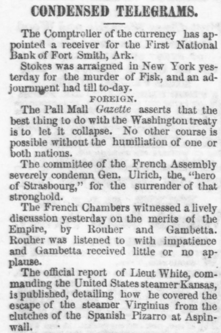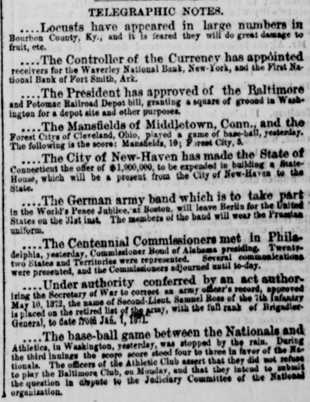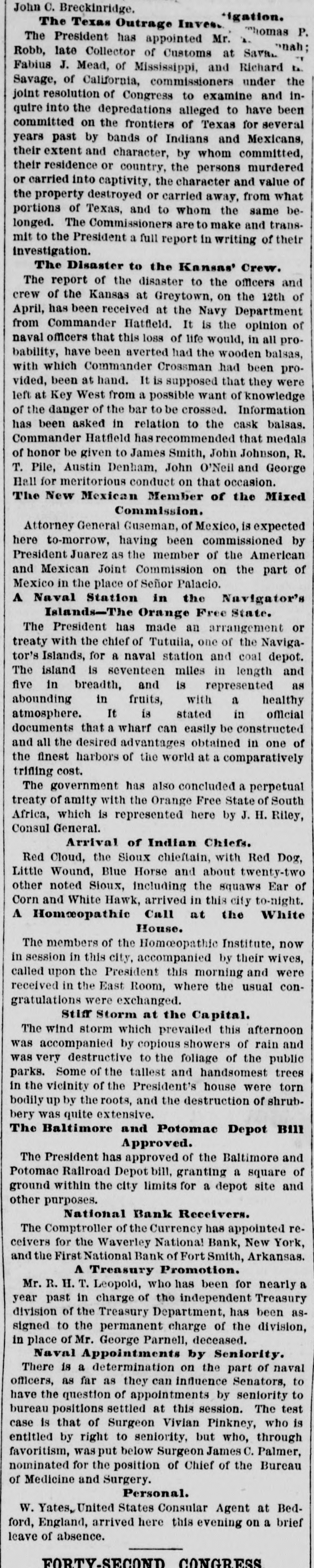 John C. Breckinridge. ligation. The Texas Outrage Invest homas P. The President has appointed Mr. A. nah: Robb, late Collector of Customs at Sava Fabius J. Mead, of Mississippi, and Richard La. Savage, of California, commissioners under the joint resolution of Congress to examine and inquire into the depredations alleged to have been committed on the frontiers of Texas for several years past by bands of Indians and Mexicans, their extent and character, by whom committed, their residence or country, the persons murdered or carried into captivity. the character and value of the property destroyed or carried away, from what portions of Texas, and to whom the same belonged. The Commissioners are to make and transmit to the President a full report in writing of their investigation. The Disaster to the Kansas' Crew. The report of the disaster to the officers and crew of the Kansas at Greytown, on the 12th of April, has been received at the Navy Department from Commander Hatfield. It is the opinion of naval officers that this loss of life would, in all probability, have been averted had the wooden balsas, with which Commander Crossman had been provided, been at hand. It is supposed that they were left at Key West from a possible want of knowledge of the danger of the bar to be crossed. Information has been asked in relation to the cask balsas. Commander Hatfield has recommended that medals of honor be given to James Smith, John Johnson, R. T. Pile, Austin Denham, John O'Neil and George Hall for meritorious conduct on that occasion. The New Mexican Member of the Mixed Commission. Attorney General Guseman, of Mexico, is expected here to-morrow, having been commissioned by President Juarez as the member of the American and Mexican Joint Commission on the part of Mexico in the place of Señor Palacio. A Naval Station in the Navigator's Islands-The Orange Free State. The President has made an arrangement or treaty with the chief of Tutuila, one of the Navigator's Islands, for a naval station and coal depot. The island is seventeen mlles in length and five in breadth, and is represented as abounding in fruits, with a healthy atmosphere. It is stated in official documents that a wharf can easily be constructed and all the desired advantages obtained in one of the finest harbors of the world at a comparatively trifing cost. The government has also concluded a perpetual treaty of amity with the Orange Free State of South Africa, which is represented here by J. H. Riley, Consul General. Arrival of Indian Chiefs. Red Cloud, the Sioux chieftain, with Red Dog, Little Wound, Blue Horse and about twenty-two other noted Sioux, including the squaws Ear of Corn and White Hawk, arrived in this city to-night. A Homropathic Call at the White House. The members of the Homoepathic Institute, now in session in this city, accompanied by their wives, called upon the President this morning and were received in the East Room, where the usual congratulations were exchanged. Stiff Storm at the Capital. The wind storm which prevailed this afternoon was accompanied by copious showers of rain and was very destructive to the foliage of the public parks. Some of the tallest and handsomest trees in the vicinity of the President's house were torn bodily up by the roots, and the destruction of shrubbery was quite extensive. The Baltimore and Potomac Depot Bill Approved. The President has approved of the Baltimore and Potomac Railroad Depot bill, granting a square of ground within the city limits for a depot site and other purposes. National Bank Receivers. The Comptroller of the Currency has appointed receivers for the Waverley National Bank, New York, and the First National Bank of Fort Smith, Arkansas. A Treasury Promotion. Mr. R. H. T. Leopold, who has been for nearly a year past in charge of the independent Treasury division of the Treasury Department, has been assigned to the permanent charge of the division, in place of Mr. George Parnell, deceased. Naval Appointments by Seniority. There is a determination on the part of naval officers, as far as they can influence Senators, to have the question of appointments by seniority to bureau positions settled at this session. The test case is that of Surgeon Vivian Pinkney, who is entitled by right to seniority, but who, through favoritism, wasput below Surgeon James C. Palmer, nominated for the position of Chief of the Bureau of Medicine and Surgery. Personal. W. Yates, United States Consular Agent at Bedford, England, arrived here this evening on a brief leave of absence. FORTY.SECONT CONGRESS