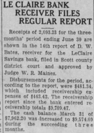 LE CLAIRE BANK RECEIVER FILES REGULAR REPORT Receipts of 2,093.23 for the three months' period ending June 30 are shown in the 14th report of D. W. Bates, receiver for the LeClaire Savings bank, filed in Scott county district court and approved by Judge W. R. Maines. Disbursements for the period, according to the report, were $481.34, which included receivership expenses of $443.43. The receivership report since the bank entered receivership totals $9,709.47. The cash balance March 31 of $7,962.20 was increased to $9,574.09 during the succeeding three months.